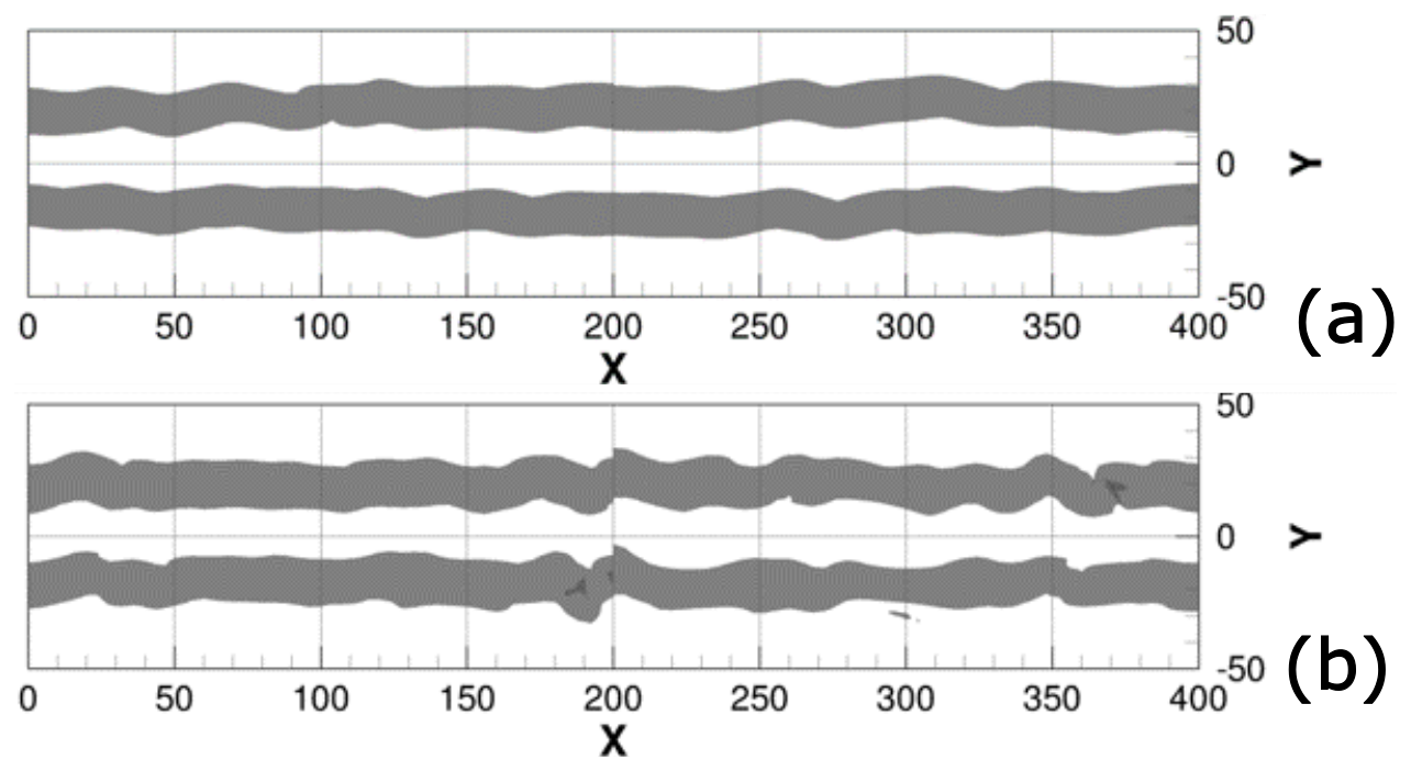 The absence of Widnall instability on the vortex pair for the 2LO initialization can be explained as follows. Widnall instability can occur in vortex pairs and is due to a resonance phenomenon between the transverse shear caused by one vortex on the other, and the existence of Kelvin waves with the same wavenumber k and azimuthal wavenumbers m and m+2. For a pair of Lamb–Oseen vortices, Sipp and Jacquin (2003) demonstrated that a narrow band of Widnall instabilities exists only for Kelvin waves with m=±1. The width of this instability band thus depends on the wavenumber kw of the Kelvin modes, the ratio rc/b0 between the vortex core radius and the distance between the vortices, and two real constants. The instability bands for the first three modes are given by: