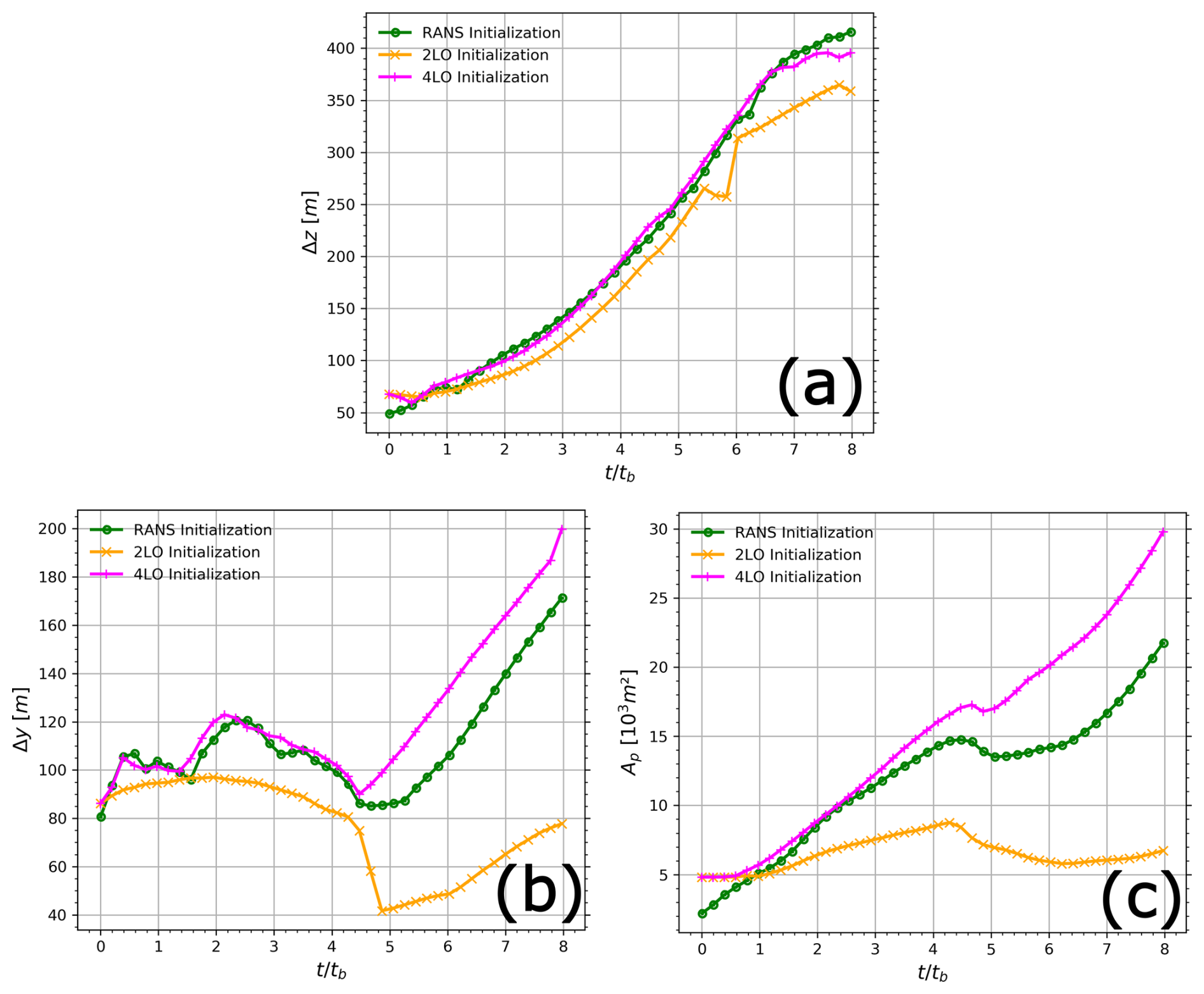 Figure 19 plots the relevant contrail dimensions as a function of time for the three different initialization strategies: RANS initialization, 2LO initialization and 4LO initialization. The corresponding spatially averaged cross-sections are plotted in Fig. 20 for the ice crystal number concentration field. In terms of height and width, 4LO initialization gives a very similar contrail in terms of size compared to the RANS initialization. The contrail has a larger cross-sectional area for the 4LO initialization but is still much closer to the RANS initialization cross-sectional area than the 2LO initialization.