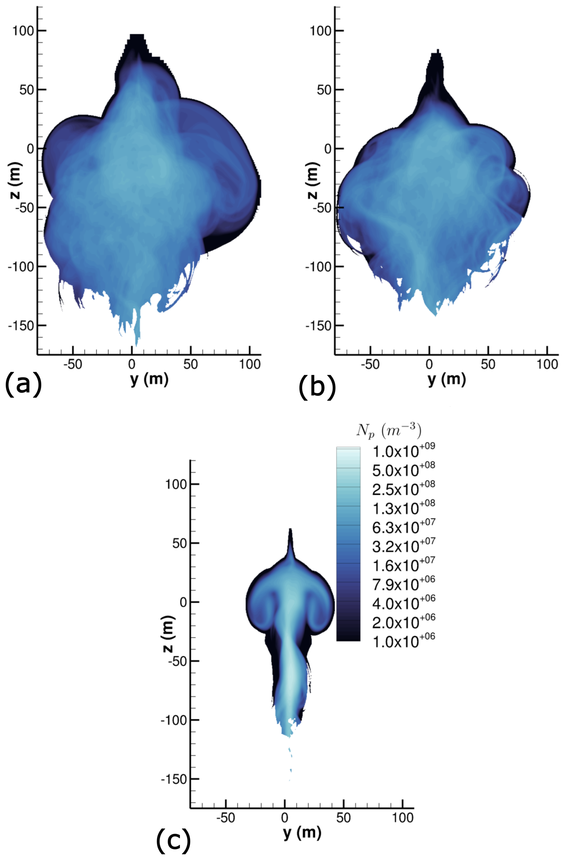 Figure 20Spatially averaged ice crystal number concentration field Np in m−3 at t/tb=8 (tb=25.7 s) and for Nb=0.012 s−1. Comparison between (a) 4LO, (b) RANS and (c) 2LO initializations. A logarithmic scale is used for the color levels.