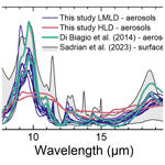 Another observation from the present analysis is the comparable intensity of the infrared absorbance, both in the MIR, FIR and the 8–12 µm window, for the Icelandic HLD compared to the LMLD samples. The integrated absorbance of HLD is indeed at the upper end of that measured for low and mid-latitude dust (Fig. 5). In a previous study, Baldo et al. (2023) estimated that Icelandic dust absorption in the solar range (370–590 nm) is at the upper end of typical values for LMLD as reported by Di Biagio et al. (2019), while in the near infrared (660–950 nm) the absorption by Icelandic dust is up to 2–8 times higher than most of dust aerosols from northern Africa and Asia. The results from Baldo et al. (2023) combined with observation from this work suggest the relevance of dust-radiation interaction for Icelandic dust across the whole atmospheric spectrum.