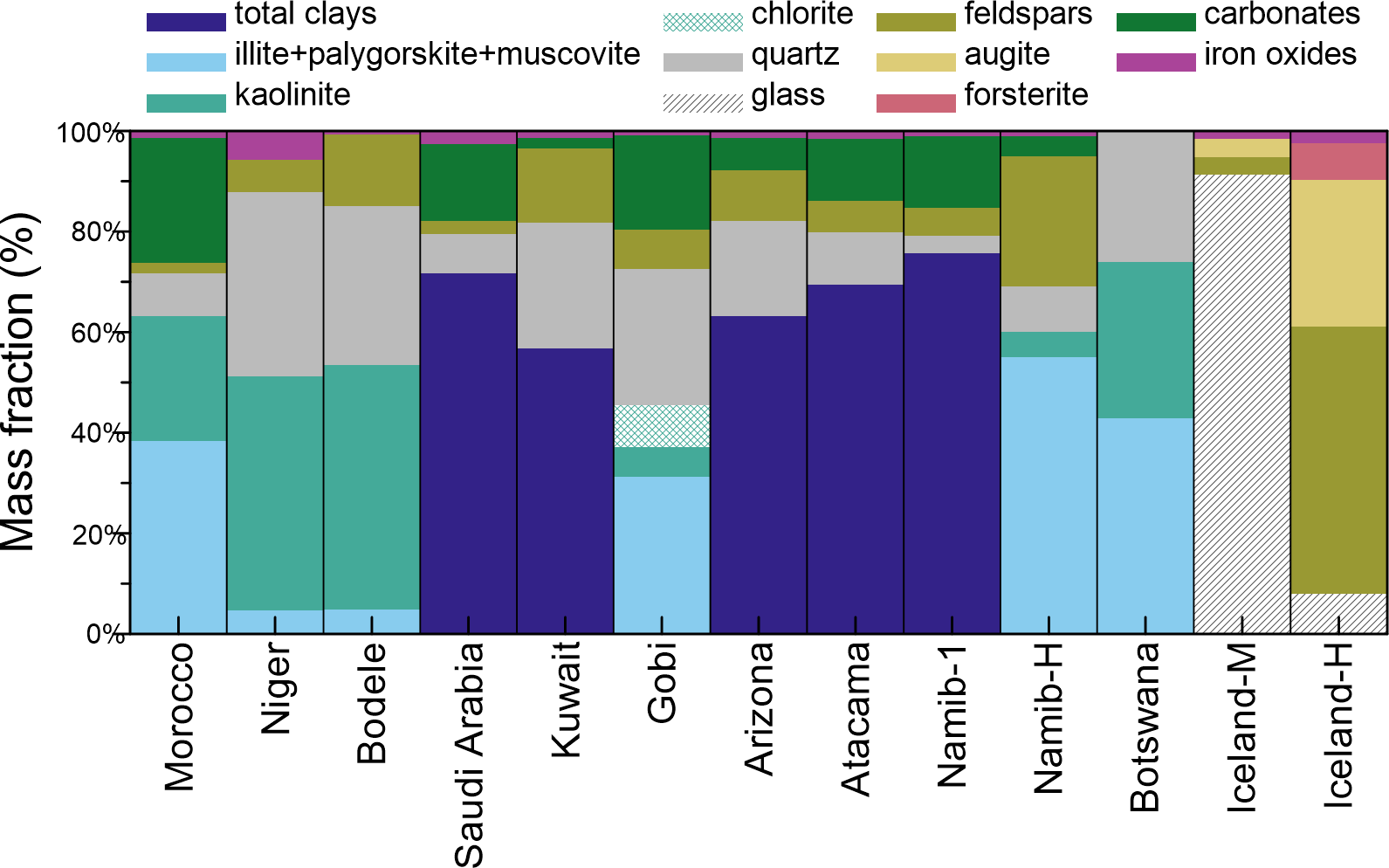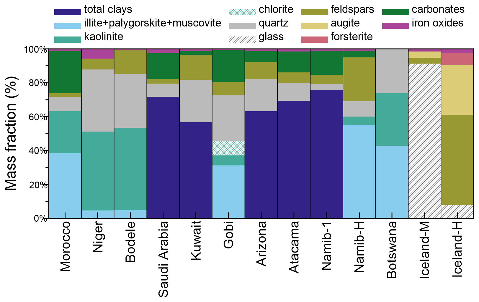 Figure 1Mineralogy of the thirteen aerosol samples considered in this study. The mass apportionment between the different clay species (illite, kaolinite, chlorite) for Morocco, Niger, Bodélé, and Gobi aerosols is based on literature values of the illite-to-kaolinite and chlorite-to-kaolinite mass ratios as discussed in Di Biagio et al. (2017), while retrieved from XRD spectra analysis for Namib-H and Botswana. For the other samples only the total clay mass is reported. The carbonates include calcite and dolomite. Iron oxides include hematite, goethite and magnetite.