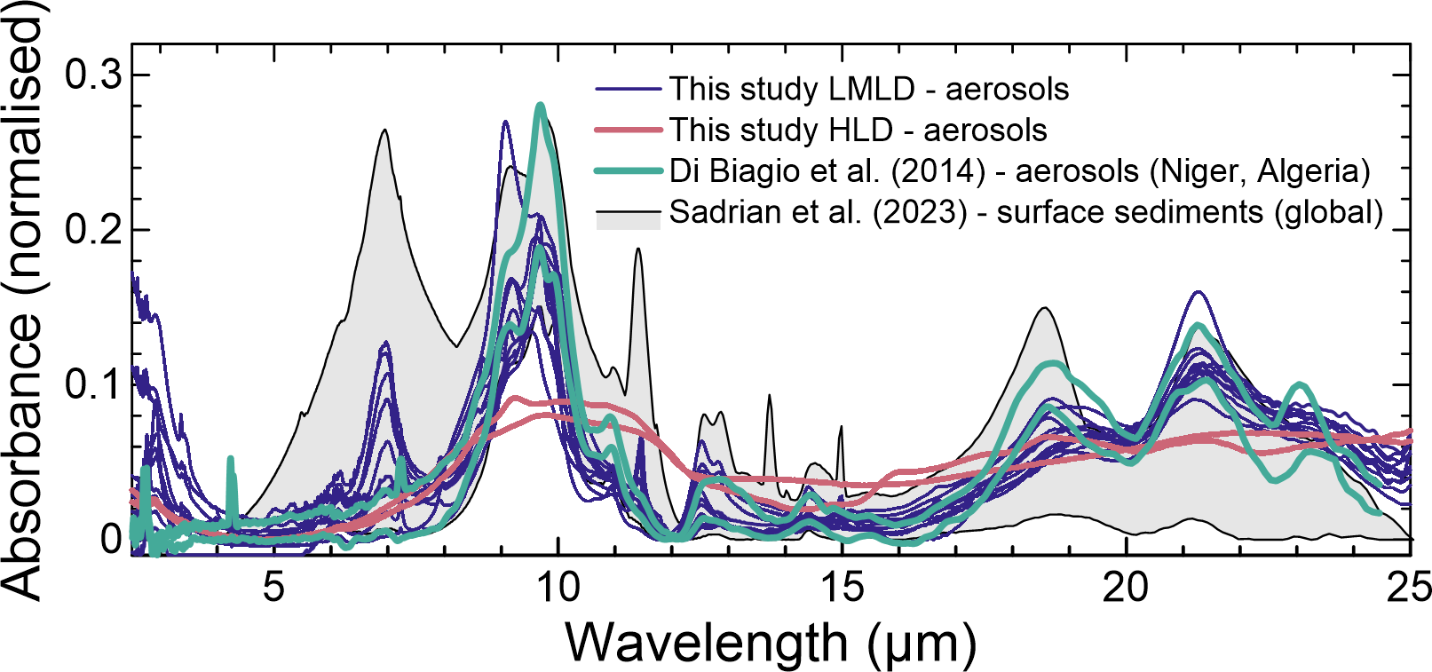 Figure 4Comparison of the absorbance spectra obtained in this study for LMLD (blue lines) and Icelandic HLD (red lines) and the pellet data obtained in Di Biagio et al. (2014b) for natural aerosols in from Niger and Algeria (green lines) and in Sadrian et al. (2023) for global surface sediments (grey shaded area). The two datasets shown for Di Biagio et al. (2014b) represent the minimum and maximum of the absorbance measured in that study. Similarly, the shaded area envelopes the range of absorbance in Sadrian et al. (2023). To facilitate the comparison, all data are normalized so that the integral of the absorbance is 1 in the 5–25 µm range.