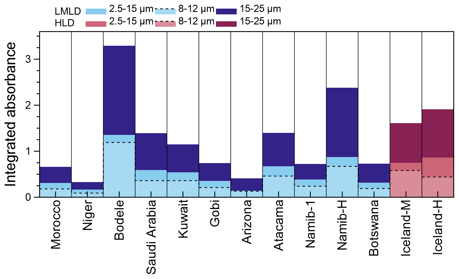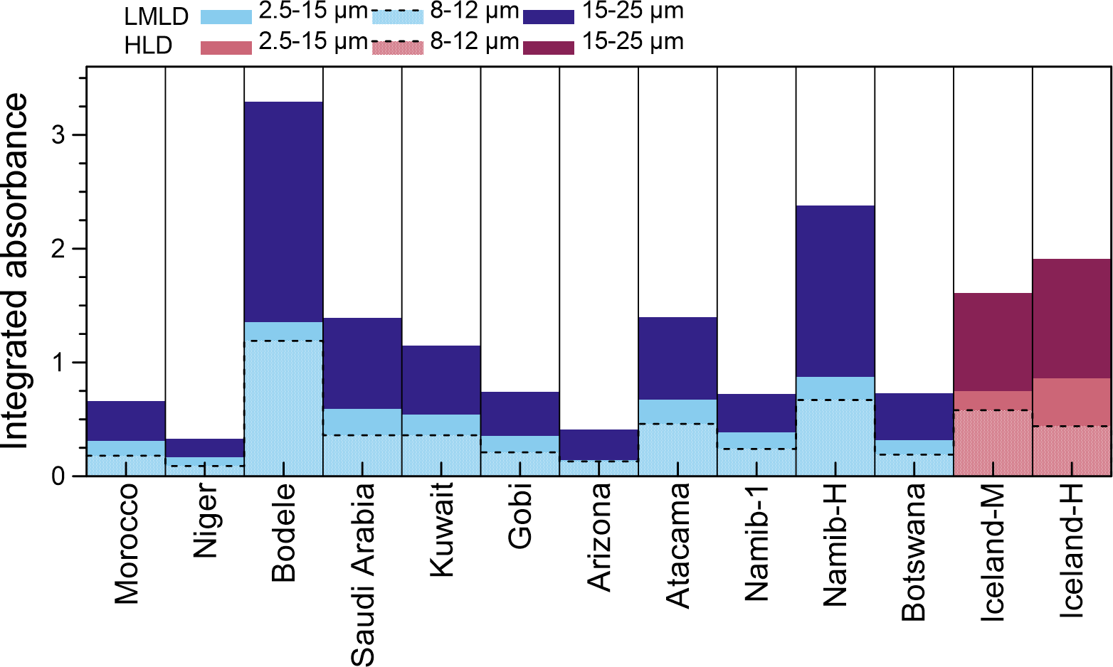 The integral of the absorbance signal in the 2.5–25 µm range for the LMLD and Icelandic HLD investigated in this study and the contributions by the MIR (2.5–15 µm) and the FIR (15–25 µm) ranges are shown in Fig. 5. The integrated spectrum in the 8–12 µm region is also shown, as it corresponds to the MIR atmospheric window, where absorption by atmospheric gases is relatively low, therefore of interest for atmospheric radiative transfer as most of the dust MIR signal is in this region.