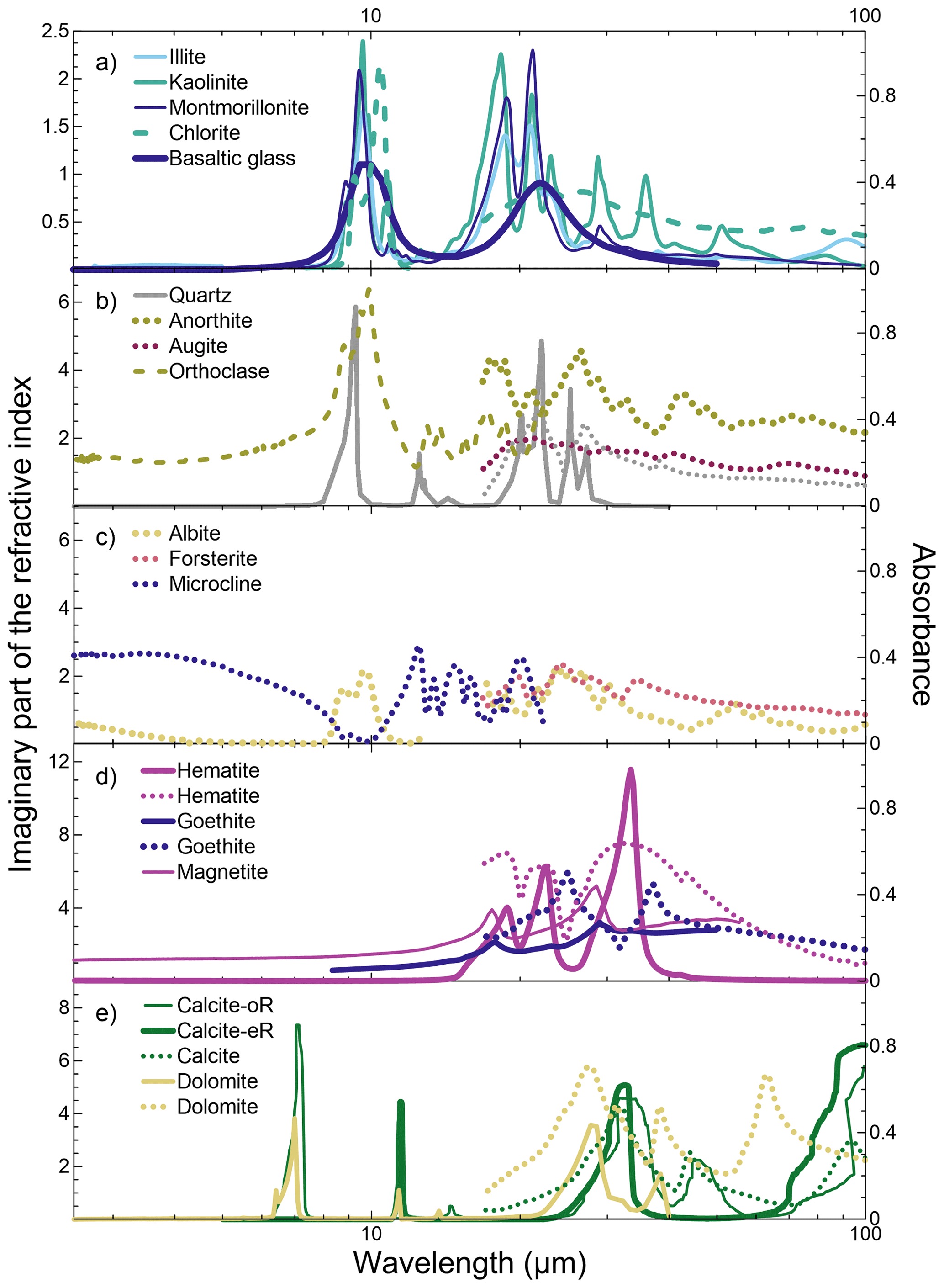 Figure 6Imaginary refractive index and absorbance spectra within the spectral range 5–100 µm for individual minerals composing low and high latitude dust. References for the plotted curves are provided in Table S2. Data are either reported as imaginary refractive index (continuous lines) or absorbance spectra (dashed or dotted lines). Original data for orthoclase (b) and albite (c) have been scaled to ease comparison.