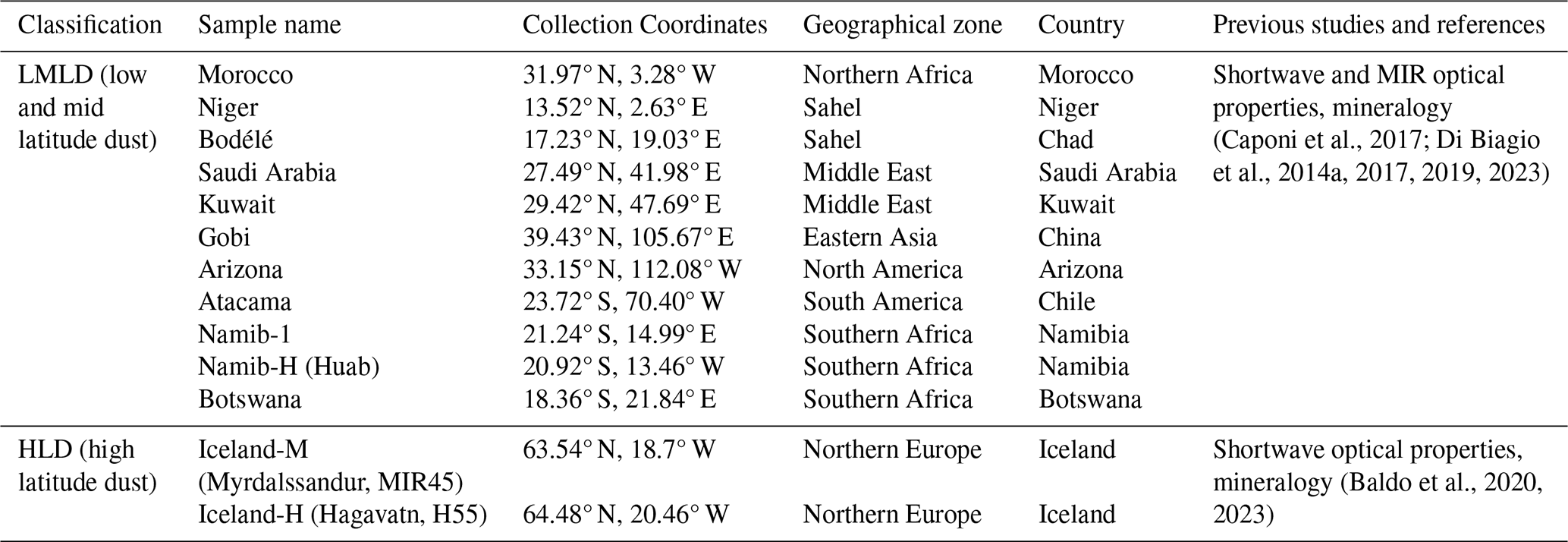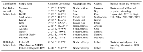For Northern Africa, we selected a soil from Morocco in the Northern Sahara and two samples from the Sahel, one in Niger and one in Chad (sediment from the Bodélé depression). These are important sources for medium and long-range dust transport towards the Mediterranean (Israelevich et al., 2002) and the Atlantic Ocean (Prospero et al., 2002; Reid et al., 2003). In particular, the Bodélé depression is one of the most active sources at the global scale (Goudie and Middleton, 2001; Washington et al., 2003). The two soils from the Middle East are from Saudi Arabia and Kuwait, which are important sources of dust to the Red and the Arabian seas (Prospero et al., 2002) and the North Indian Ocean (Leon and Legrand, 2003). For the second largest global source of dust, Eastern Asia, we studied one sample from the Gobi desert. For North and South America, soils were collected in the Sonoran Desert in Arizona and the Atacama Desert in Chile. The Sonoran Desert is a permanent source of dust in North America, the Atacama Desert is the most important source of dust in South America (Ginoux et al., 2012). For Southern Africa, we selected two soils from the Namib desert, one from the area between the Kuiseb and Ugab valleys (Namib-1, already studied in Di Biagio et al., 2017, 2019) and the other from the Huab ephemeral river bed (Namib-Huab), both of which are sources of dust transported towards the South-Eastern Atlantic (Vickery et al., 2013). A sample from Botswana was also selected, as an additional source from Southern Africa (Bhattachan et al., 2013, 2015). Surface sediment samples collected from two major dust hotspots in Iceland (H55, Hagavatn, and MIR45, Mýrdalssandur), which significantly contribute to the total dust emissions from this region (Arnalds et al., 2016), were also investigated. Iceland is the major documented emitting HLD source so far (Meinander et al., 2022).