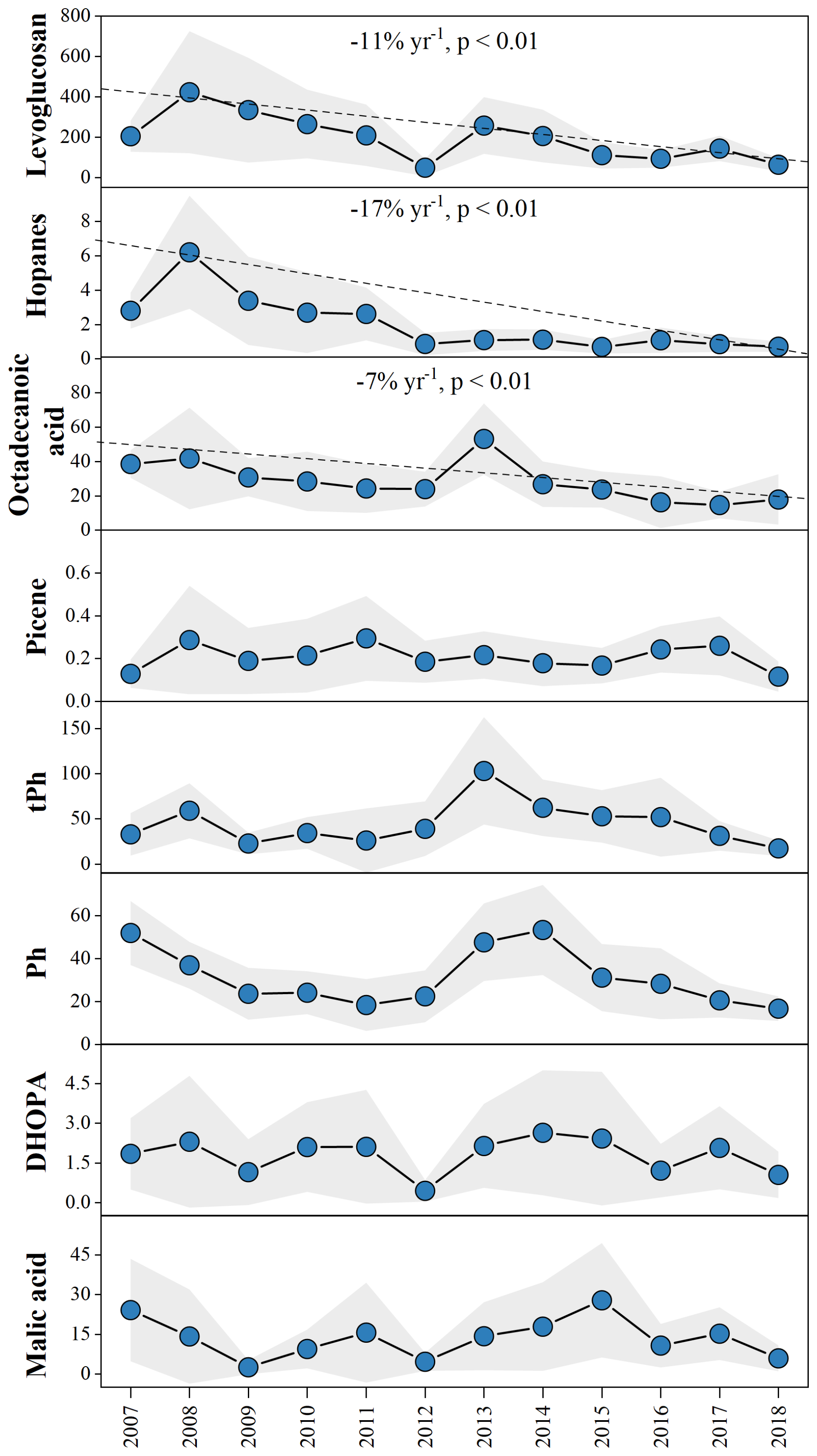 Figure 1Annual variations in different molecular markers (ng m−3) in the PRD during 2007 to 2018. The shaded area represents the 95 % prediction band.