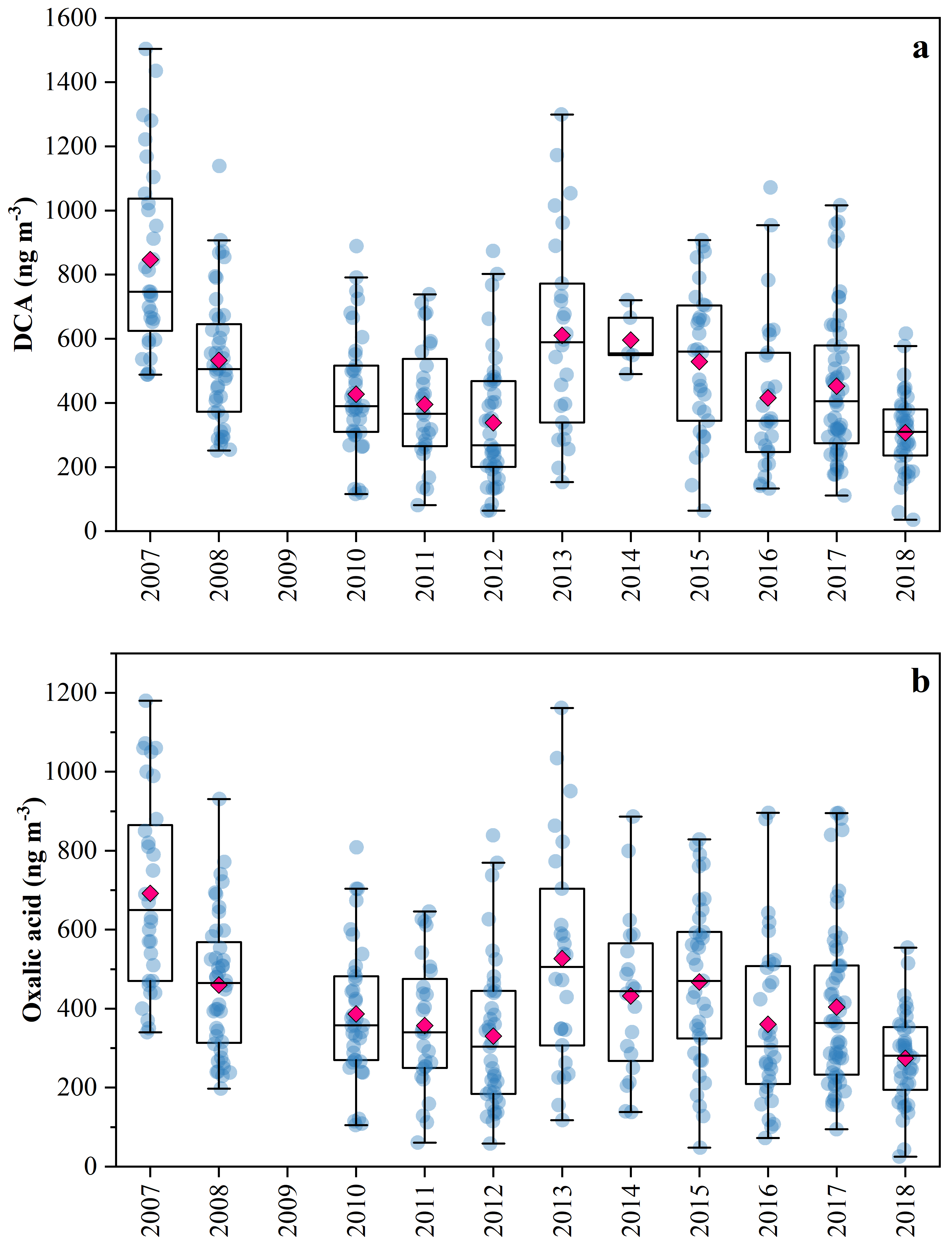 Figure 2(a) Annual variations in aliphatic DCA. (b) Annual variations in oxalic acid. Due to the absence of aliphatic DCA and oxalic acid measurements in 2009, their concentrations for that year are not presented.