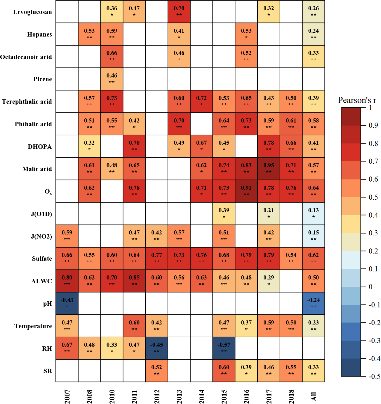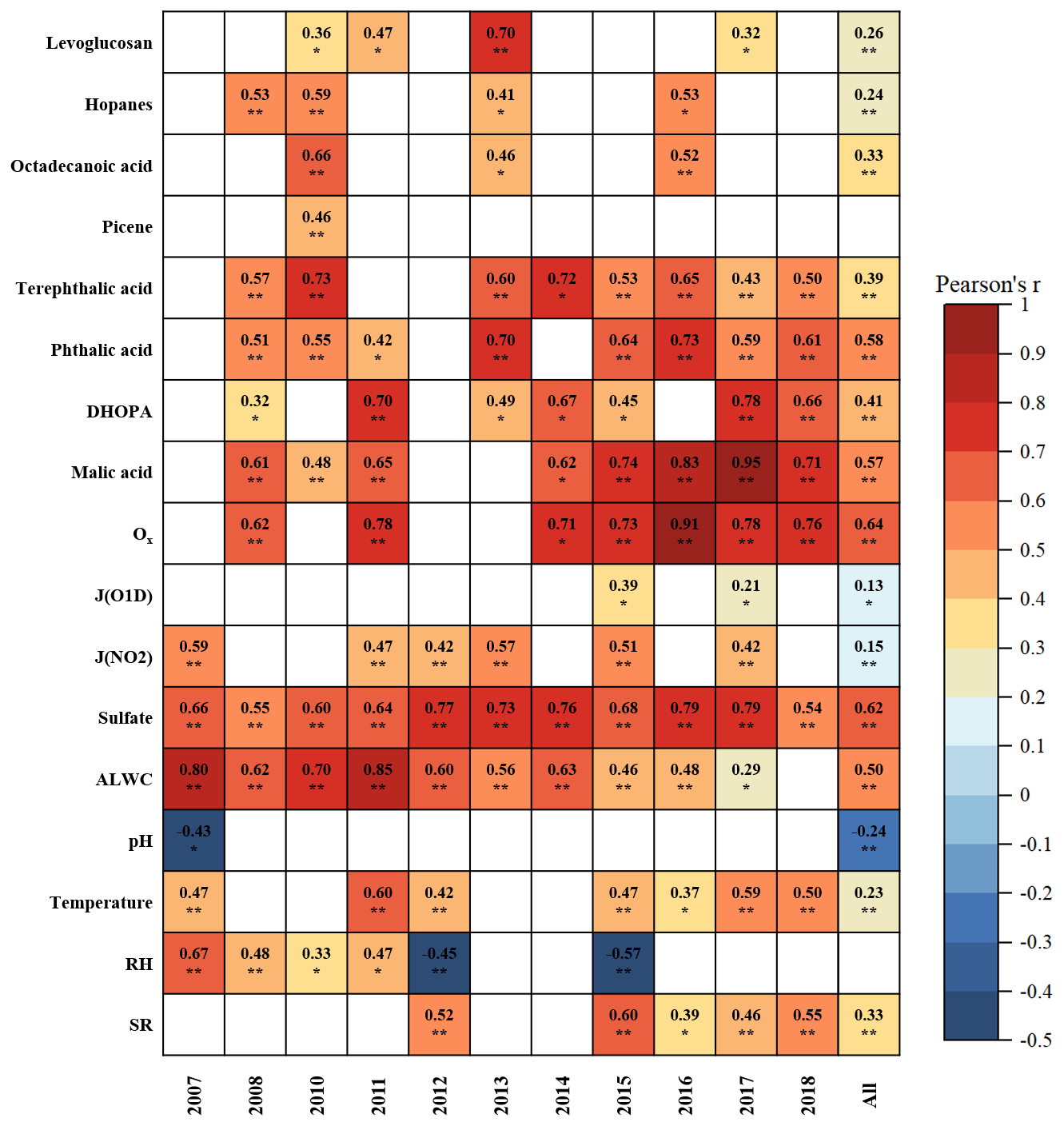 Figure 3Correlations between C2 and primary anthropogenic source markers, SOA markers, indicators for gas- and aqueous-phase oxidation, as well as meteorological parameters. Blank cells indicate no significant correlations. One asterisk, two asterisks denote p value < 0.05, 0.01, respectively. Due to the unavailability of Ox data in 2012 and 2013, correlation analysis was not conducted for these 2 years.