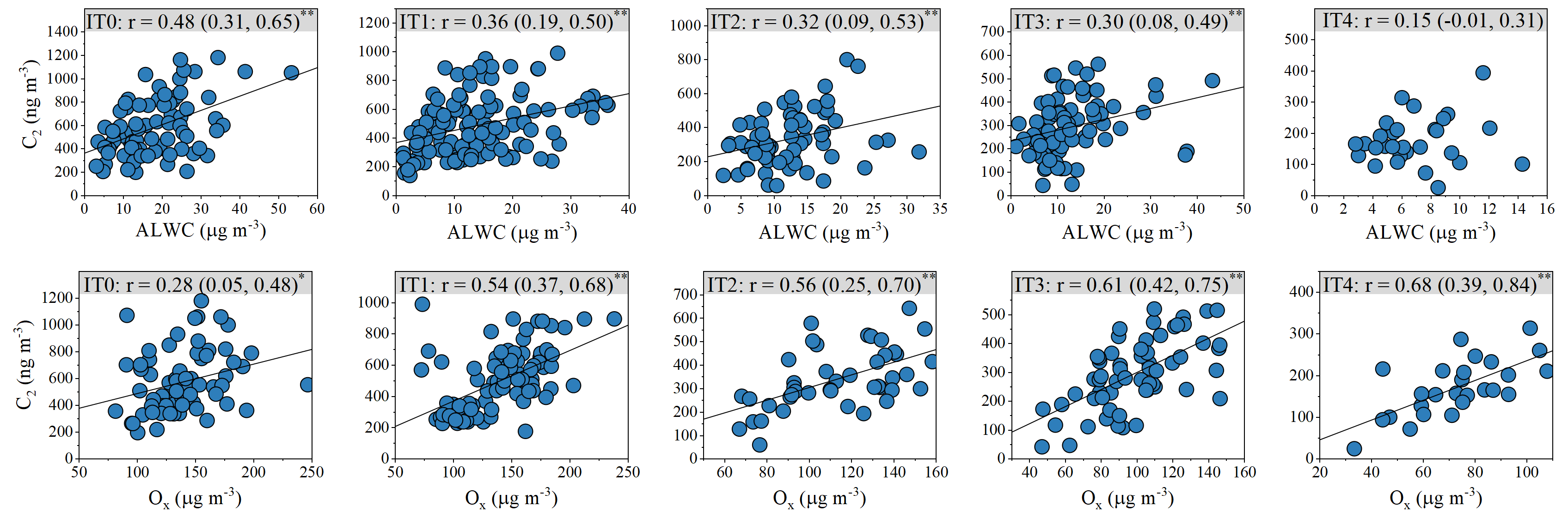 Figure 4The correlation between C2 and ALWC, as well as Ox. The values in brackets indicate the 95 % confidence intervals (CIs) of the correlation coefficients. One, two asterisks denote p values less than 0.05, 0.01, respectively. With decreasing pollution levels, the correlation between C2 and ALWC weakens, whereas that between C2 and Ox strengthens.