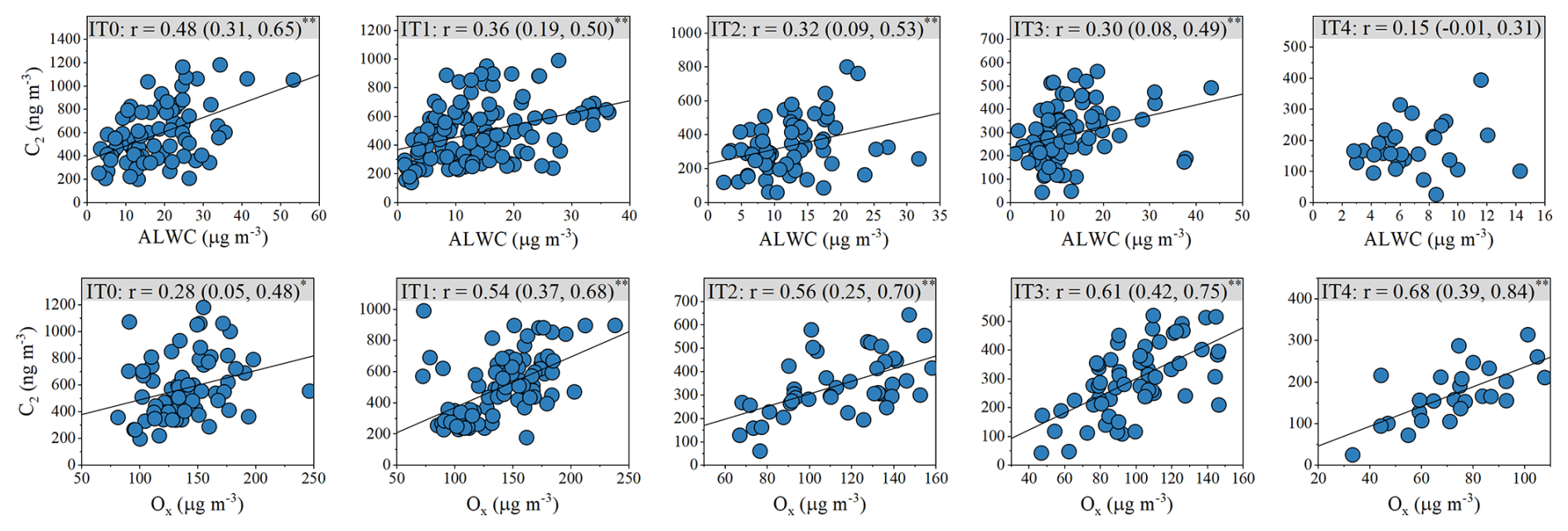 The Pearson correlation coefficients reflect the strength of linear associations but do not directly represent the quantitative contribution of each factor. Thus, the lower Pearson's r values between C2 and ALWC than those between C2 and Ox under IT1-IT4 do not necessarily imply a smaller impact of aqueous-phase pathways compared with gas-phase pathways. Here, correlation analysis is used primarily to identify potential drivers and their changing patterns, while a machine learning model is further applied to quantify their impacts to C2 variations.