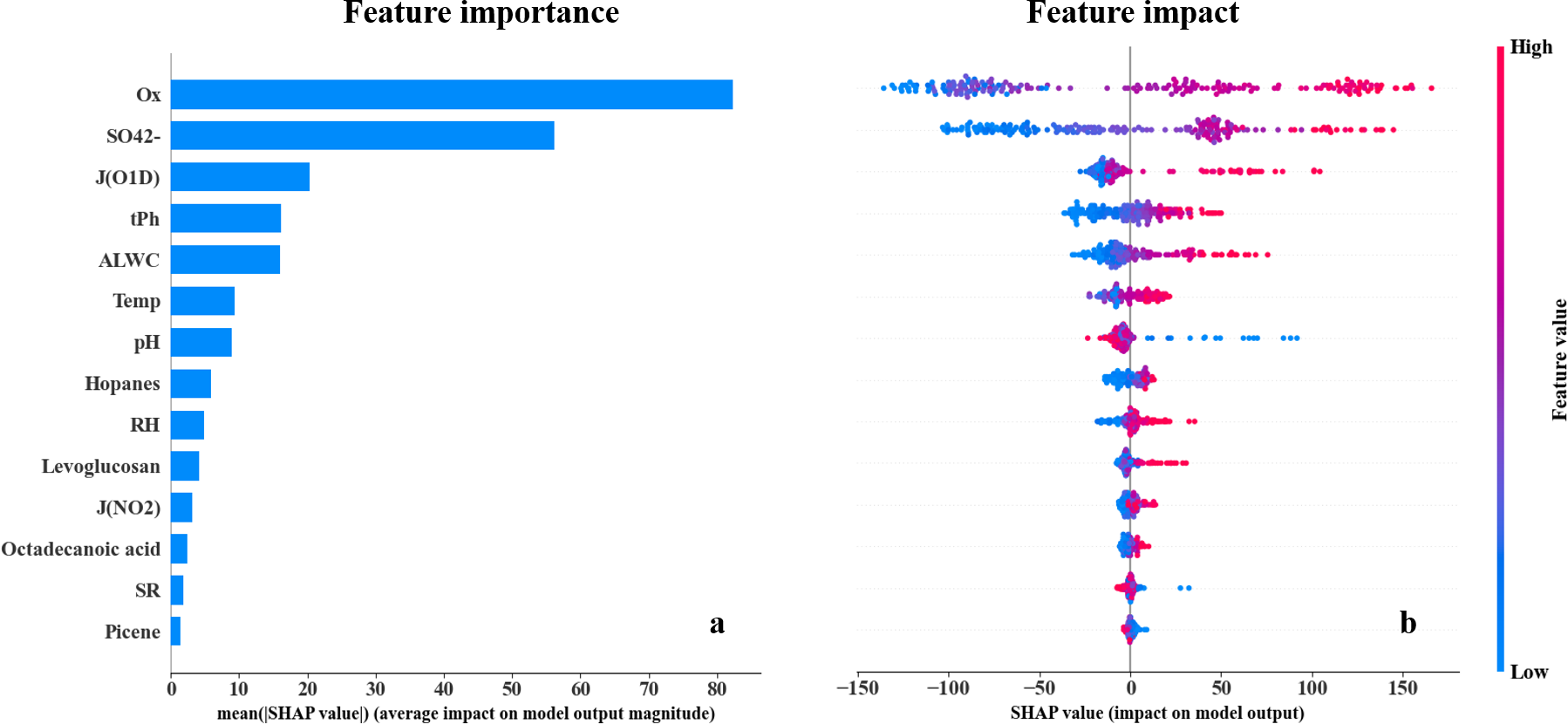 The feature importance is presented in Fig. 5a. Ox, sulfate, and J(O1D), which represent secondary oxidation processes, exhibited the three highest |SHAP| values, indicating their dominant impacts on C2 variation. Although pH and ALWC exhibited relatively high feature importance among all variables, their |SHAP| values were lower than sulfate. This is because pH and ALWC in this study was calculated by a thermodynamic equilibrium model, ISORROPIA II (Nenes et al., 1998), in which sulfate plays a crucial role and partly reflects variations in both pH and ALWC. In contrast, the feature importance of anthropogenic emission markers and meteorological parameters were relatively lower, suggesting that the impacts of AVOC and BVOC emissions were smaller compared to that of secondary processes. As shown in Fig. 5b, Ox, sulfate, and J(O1D) exhibited obviously positive correlations with their SHAP values, indicating that higher values of these variables contributed to increases in C2 concentrations. However, pH showed a negative correlation with its SHAP values, suggesting that lower pH levels were associated with higher C2 concentrations. Notably, the influence of extremely low pH on C2 formation appeared to be more pronounced.