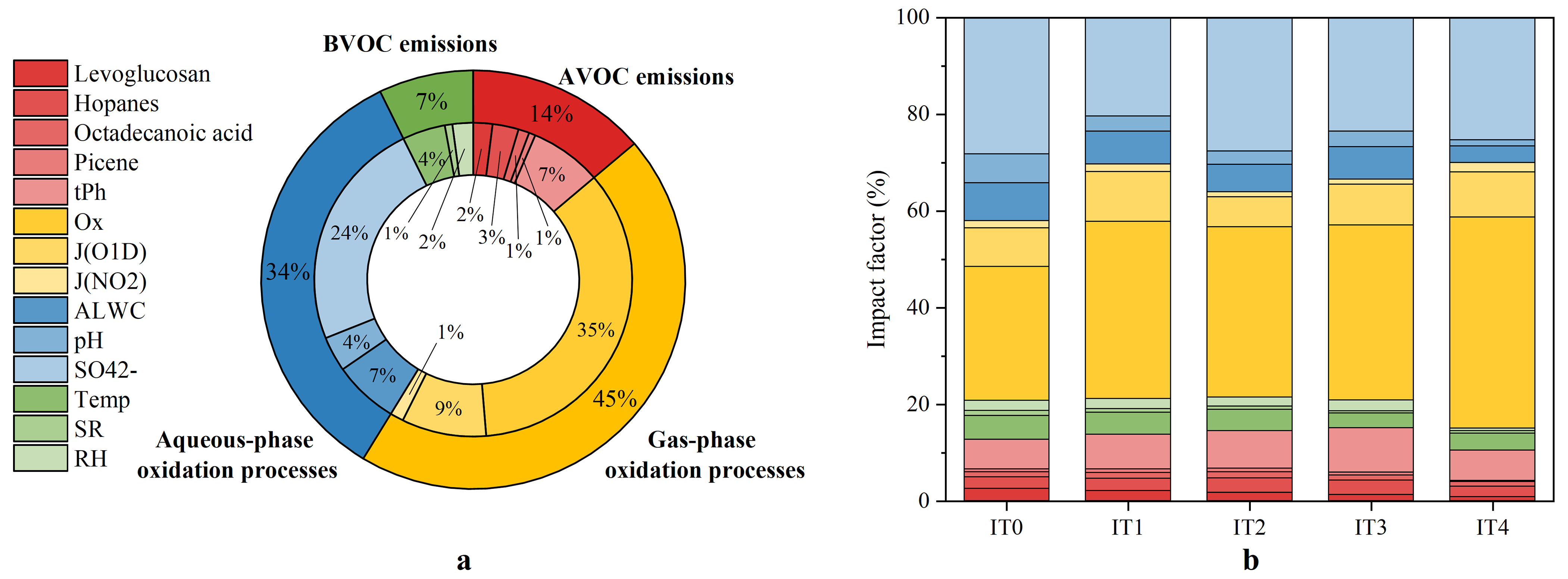 The IF values for each variable are presented in Table S10 in the Supplement. From IT0 to IT4, IF values for gas-phase oxidation processes increased from 37 % to 55 %, whereas those for aqueous-phase oxidation processes decreased from 42 % to 30 % (Fig. 6b). Meanwhile, IF values for AVOC (10 %–15 %) and BVOC emissions (5 %–8 %) remained at a low and stable level. These findings indicated that the gas-phase oxidation pathway became increasingly important as pollution levels decreased. A possible explanation is that under cleaner conditions, lower ALWC levels would suppress the partitioning of semi-volatile C2 precursors (e.g., Gly and mGly) from the gas-phase into the particle-phase (Hu et al., 2022). In addition, less ALWC participates in heterogeneous reactions of SOA intermedium as a nucleophile. Thus, their aqueous-phase pathway was hindered, and more C2 was formed via photochemical degradation of longer-chain DCA (Kawamura and Bikkina, 2016; Meng et al., 2023). This indicated the growing importance of gas-phase oxidation processes in the formation of C2 and SOA under cleaner conditions. Although Ox did not exhibit a clear trend at our measurement station, Cao et al. (2024) reported a rapid increase in O3 concentration across the PRD region over the past decade. This may promote SOA formation through enhanced gas-phase oxidation pathways. Therefore, coordinated control of VOCs and NOx should be emphasized (Wang et al., 2021b) in the future to reduce ozone pollution and further mitigate SOA formation.