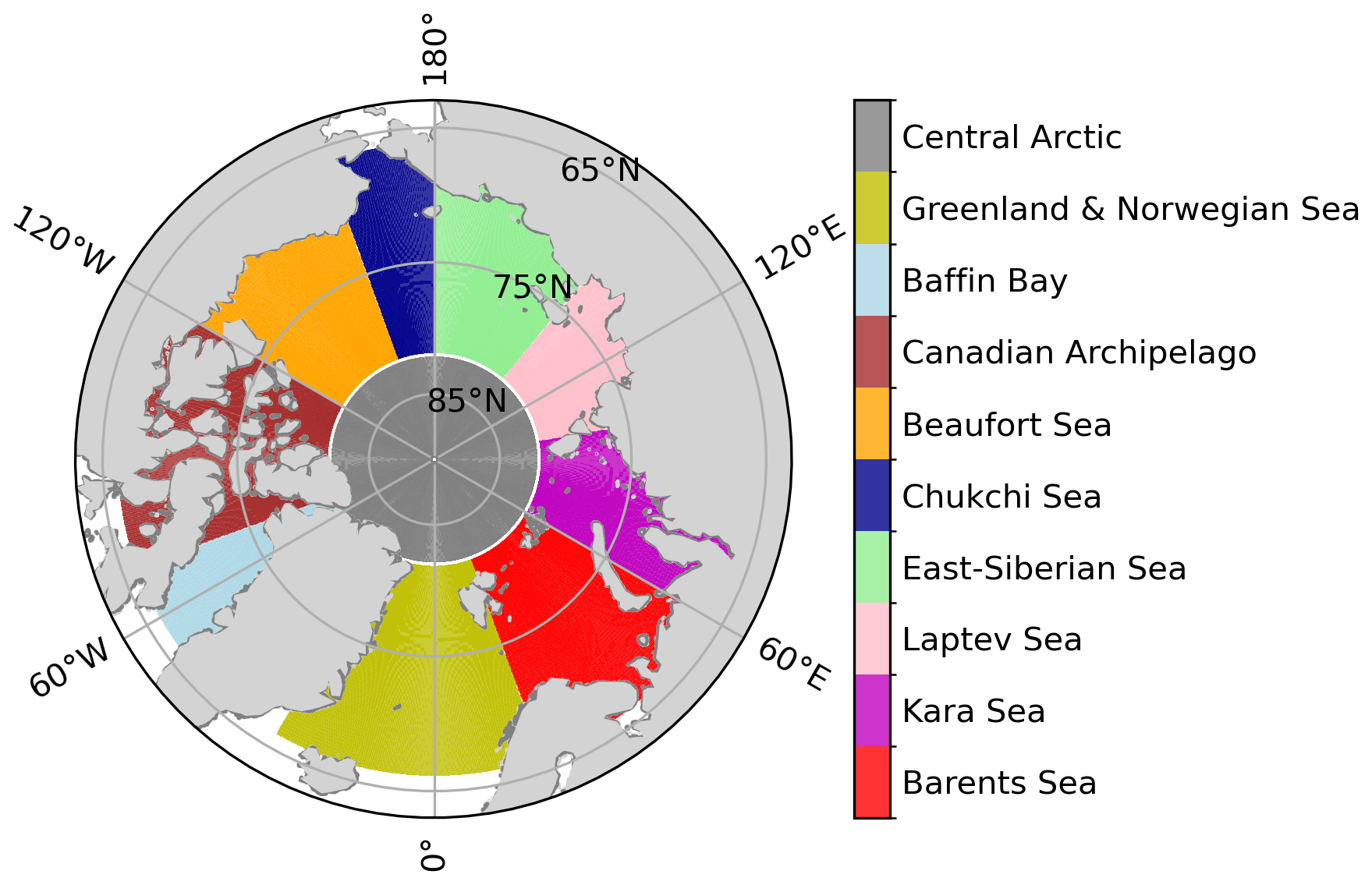 Figure 1Map of Arctic Ocean subregions considered in this study. Lateral boundaries were defined following the oceanic region definitions by Nöthig et al. (2020) and Randelhoff et al. (2020), whereas latitudinal limits were modified and extended to uniformly cover 66–82° N for all regions except the Central Arctic (82–90° N).