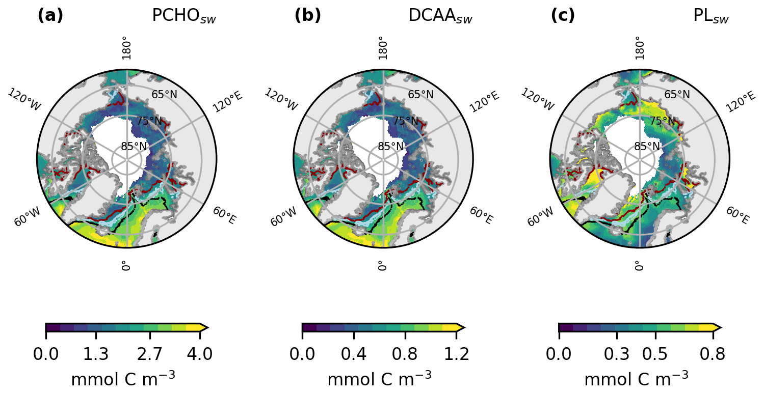 The simulated biomolecule ocean concentrations are shown in Fig. 2 as a multiannual average from May to September over the period 1990–2019. In terms of carbon contribution, PCHOsw dominates in seawater, with a mean concentration over the Arctic circle of 1.4 mmol C m−3, followed by DCAAsw (0.4 mmol C m−3) and PLsw (0.3 mmol C m−3). The distribution of PCHOsw and DCAAsw (Fig. 2a and b) presents a nearly identical geographical distribution, since the latter was computed as a fraction of simulated PCHOsw. In contrast, PLsw spatial patterns are rather distinct (Fig. 2c). For instance, notably greater concentrations are seen in the Norwegian Sea and North Atlantic compared to the central Arctic and vice versa for the semi-labile and lipid groups, respectively. Hence, a description of the seasonal particularities of regions within the Arctic Ocean that determine the distribution of the biomolecules is provided further below.