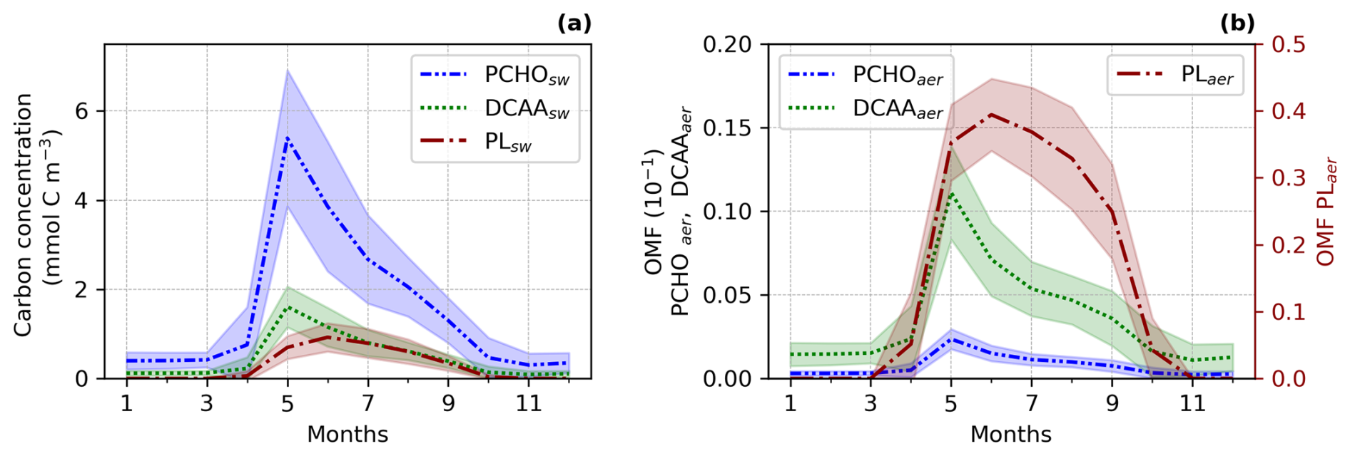 The OMF in nascent aerosol shows a similar seasonal pattern, with the highest contributions in spring and summer (Fig. 3b). However, the OMF of the aerosol species (PCHOaer, DCAAaer and PLaer) do not behave as their precursors in the ocean. PCHOaer has the lowest OMF, followed by DCAAaer and PLaer. The high surface affinity of lipids positions PLaer as the major contributor to marine organic aerosol during months with high biological productivity. Values are as high as 0.4 ± 0.05. OMF for PLaer is at least one to two orders of magnitude higher than for PCHOaer and DCAAaer, respectively. Whereas PCHOaer and DCAAaer remain within 10−3 and 10−2 throughout the year (note that PCHOsw has the lowest surface affinity), PLaer decreases to negligible values as the PLsw concentration in the ocean approaches almost zero in winter months (Fig. B1).