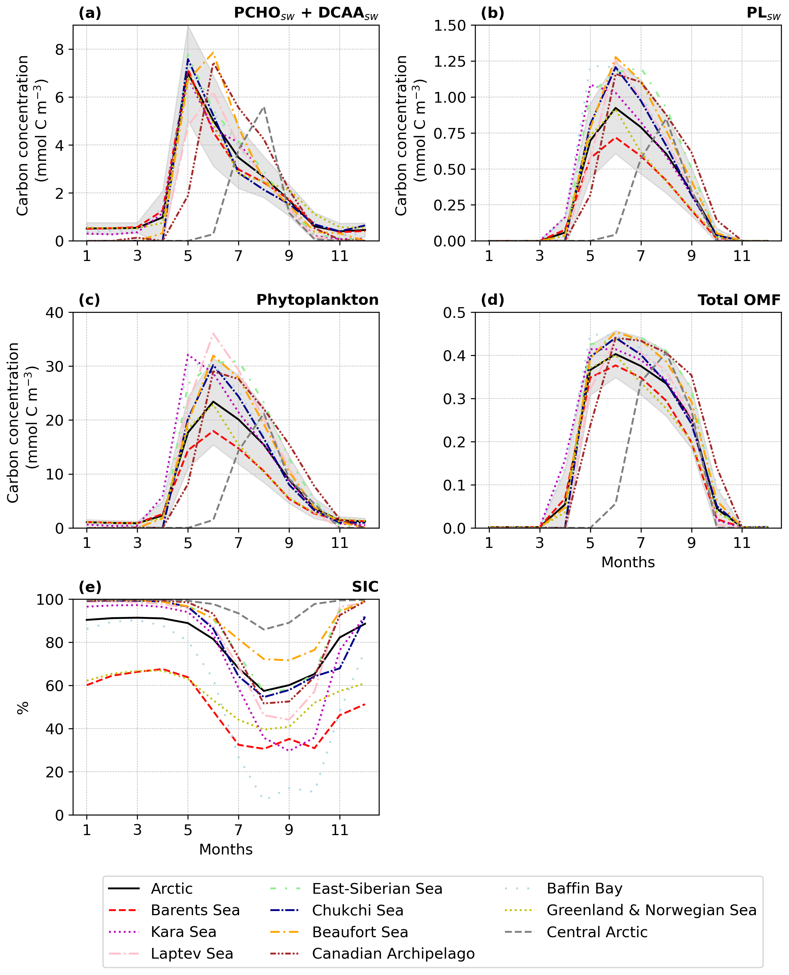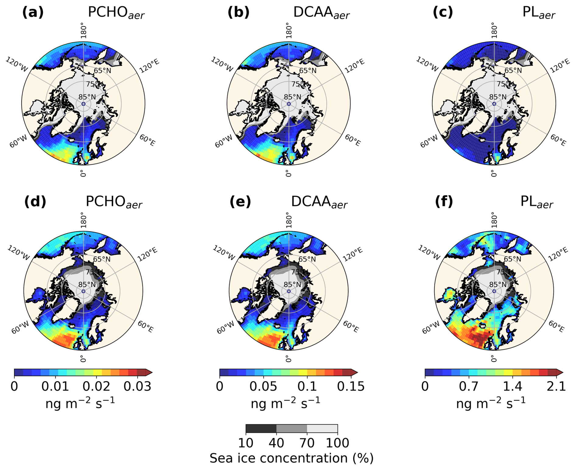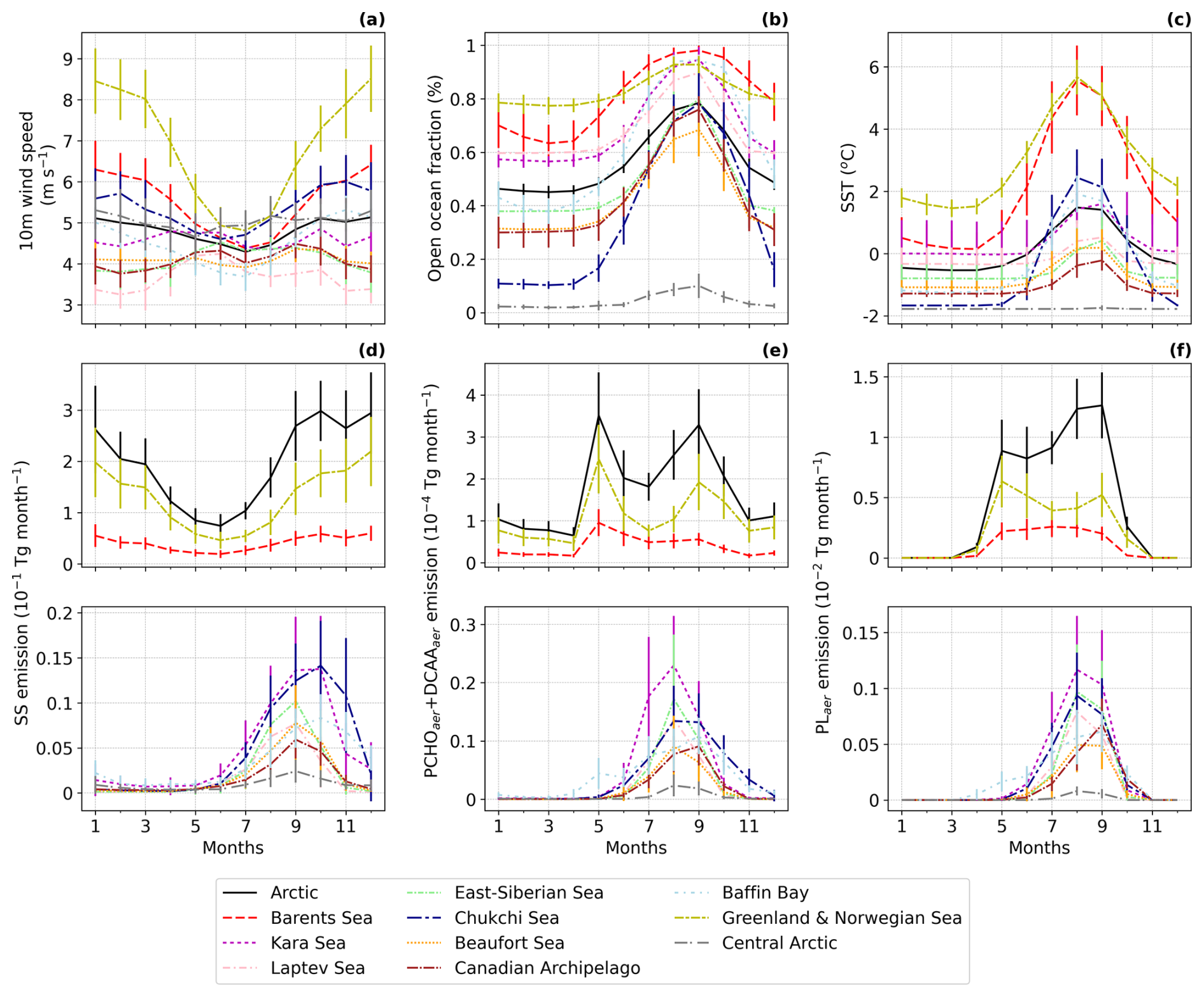 Notably, lower emissions of marine biomolecules occur in the other Arctic subregions due to lower sea salt fluxes. As sea spray occurrence is strongly affected by sea ice cover, organic aerosols become more relevant towards the end of the melting season. Hence, organic emissions peak from July to September and decline to values near zero throughout the winter. For these regions, PL emission seasonality has more similarities to that of PCHOaer+DCAAaer. Nevertheless, the latter often reach their seasonal peak ahead of PLaer. The Kara Sea has the highest emissions, followed by the East Siberian Sea, the Chukchi Sea, and the Laptev Sea. The summer sea-ice melt likely drives the difference in emissions magnitude among these seas. Note that, compared to sea salt, the slopes and the smoothness of the curves vary for all marine species. Moreover, regions with the highest SS fluxes are not necessarily those with the highest organic emissions. For instance, in contrast to organic species, SS contributions in the Chukchi Sea are comparable to those in the Kara Sea Fig. 5d). These distinguishable characteristics evidence the effect of marine biological activity on emission seasonality patterns.
