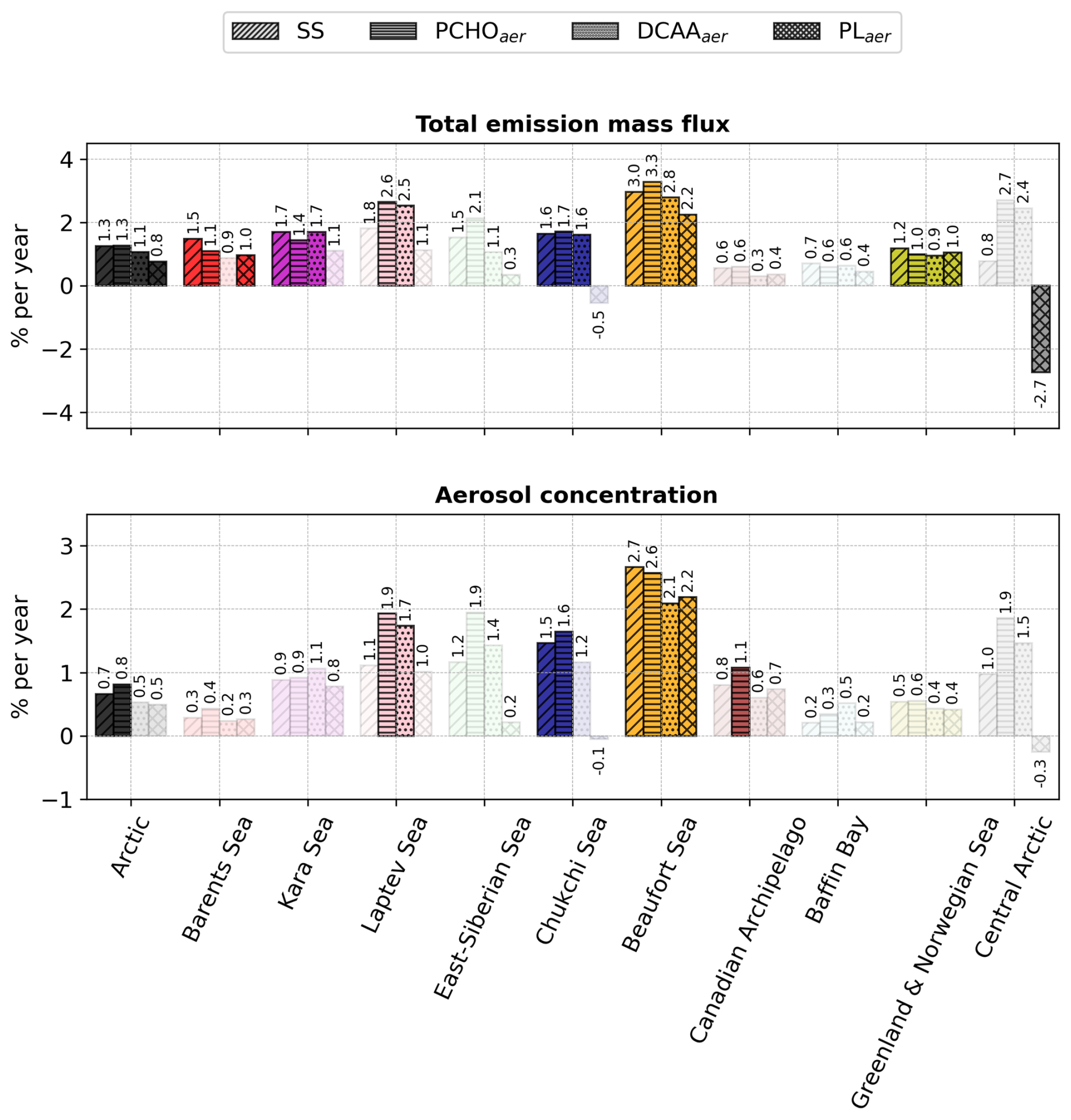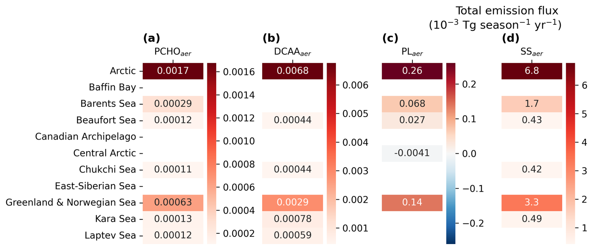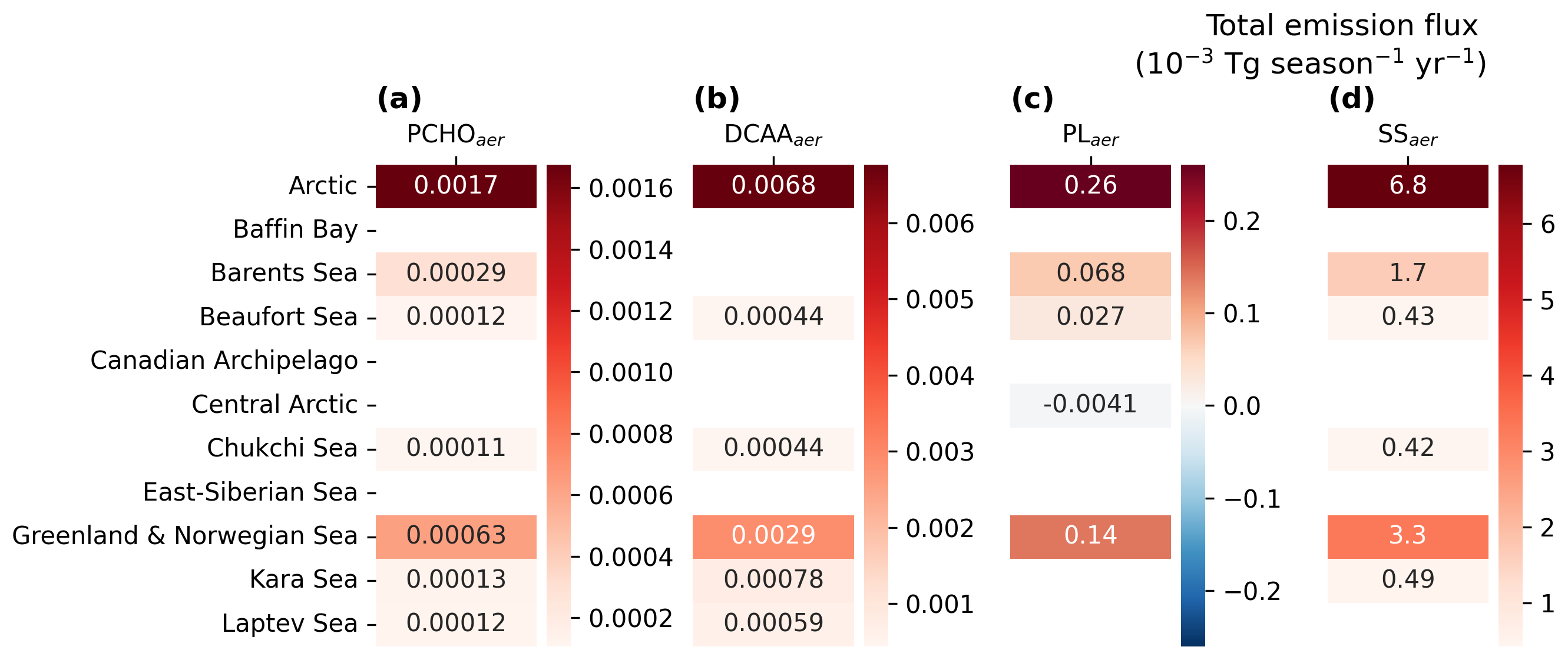 Notably, lower emissions of marine biomolecules occur in the other Arctic subregions due to lower sea salt fluxes. As sea spray occurrence is strongly affected by sea ice cover, organic aerosols become more relevant towards the end of the melting season. Hence, organic emissions peak from July to September and decline to values near zero throughout the winter. For these regions, PL emission seasonality has more similarities to that of PCHOaer+DCAAaer. Nevertheless, the latter often reach their seasonal peak ahead of PLaer. The Kara Sea has the highest emissions, followed by the East Siberian Sea, the Chukchi Sea, and the Laptev Sea. The summer sea-ice melt likely drives the difference in emissions magnitude among these seas. Note that, compared to sea salt, the slopes and the smoothness of the curves vary for all marine species. Moreover, regions with the highest SS fluxes are not necessarily those with the highest organic emissions. For instance, in contrast to organic species, SS contributions in the Chukchi Sea are comparable to those in the Kara Sea Fig. 5d). These distinguishable characteristics evidence the effect of marine biological activity on emission seasonality patterns.