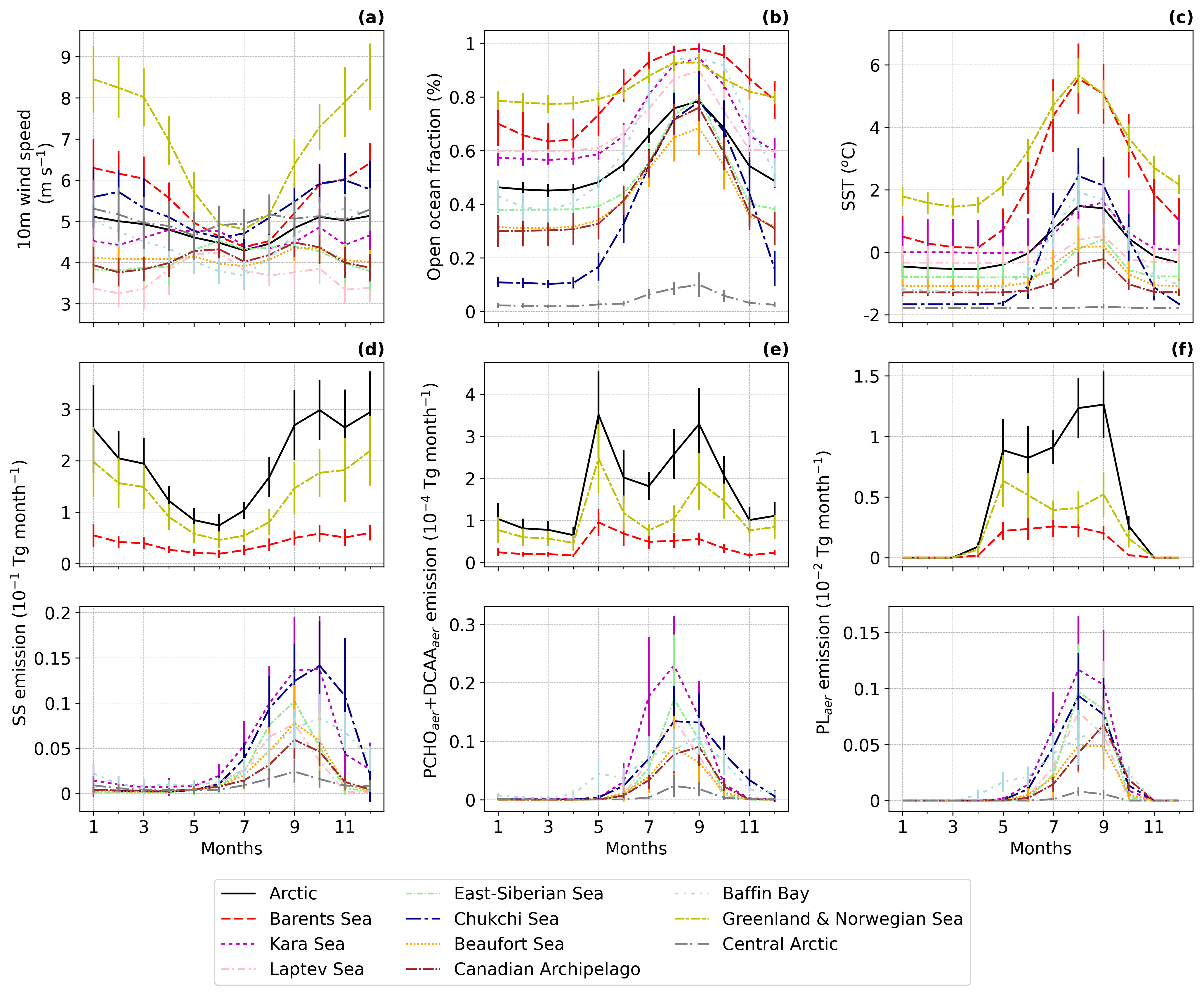 Figure 5Seasonal climatology of (a) 10 m Wind speed, (b) Open ocean fraction, (c) SST and emission fluxes of (d) SS, (e) PCHOaer+DCAAaer and (f) PLaer for the period 1990–2019 simulated by ECHAM-HAM model averaged over the Arctic and all seas within the Arctic Ocean (Fig. 1). Monthly emissions were obtained by summing the daily values across all grid cells in the region and then averaging over the 30 year period. The error bars indicate the multiannual standard deviation. Subregions with small emission fluxes are shown in a separate panel for better representation.