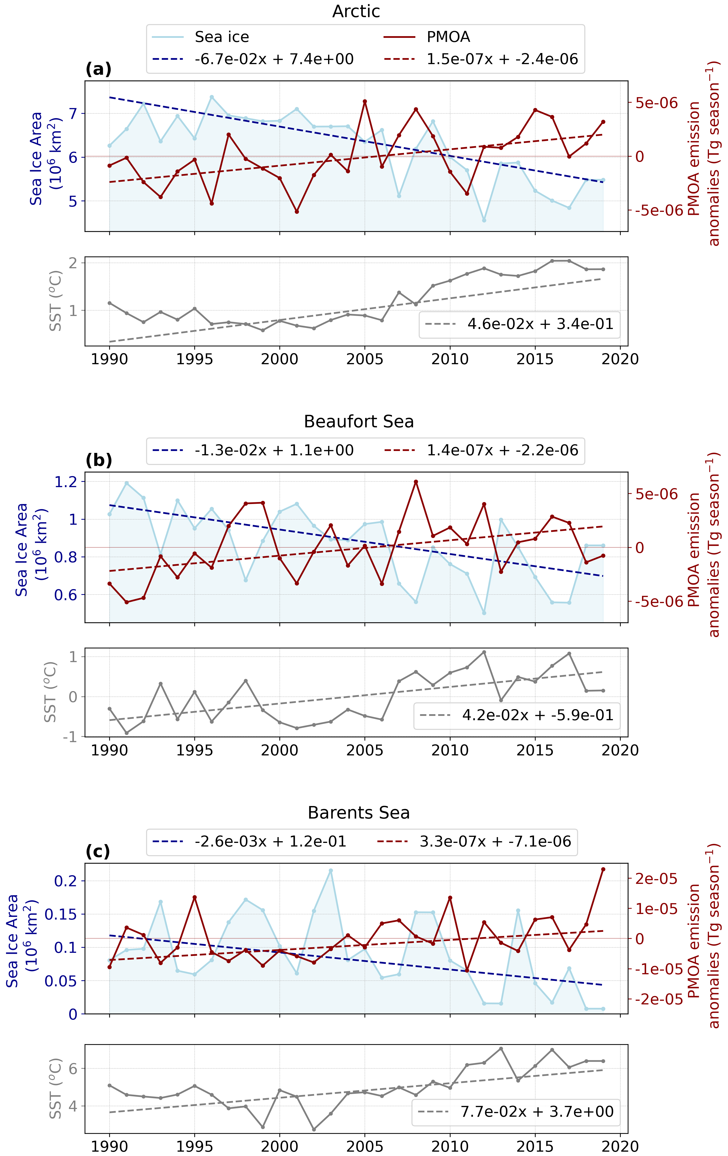 Figure 7Time series of sea ice area in blue, averaged PMOA (PCHOaer+DCAAaer+PLaer) emission mass flux anomalies in red and mean SST as an additional panel in grey for (a) the Arctic, (b) Beaufort Sea and (c) Barents Sea as defined in Fig. 1 for July–August–September of the simulated period 1990–2019 by ECHAM-HAM model. Dashed lines depict the trend line calculated using the slope and intercept values derived from the Theil–Sen slope estimator.