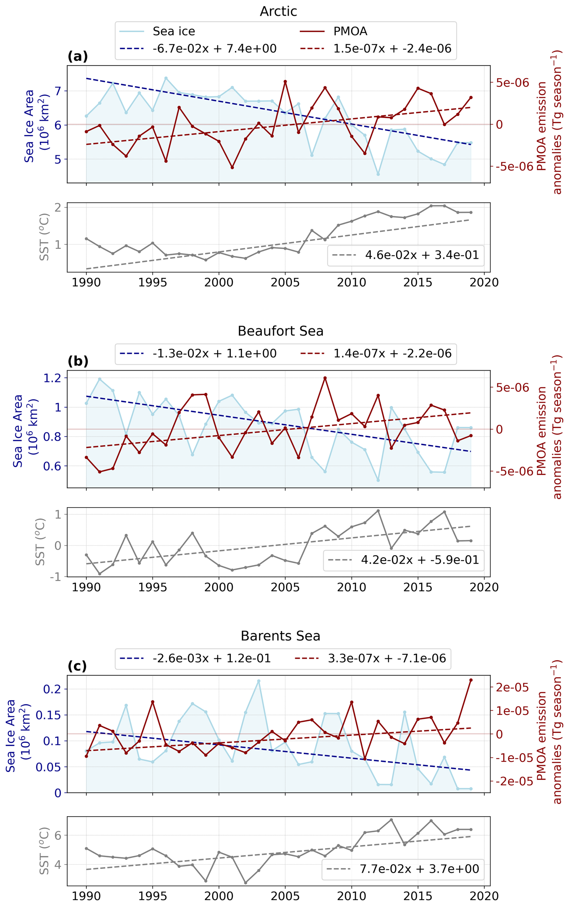 Here, the pan-Arctic trends in sea ice extent, SST and PMOA emission anomalies are investigated. Figure 7 shows the time series of averaged summer sea ice area and total PMOA emission anomalies with respect to the period mean for 1990–2019 simulated by the ECHAM-HAM model. The yearly mean values for the Arctic Ocean and preferred subregions within the Arctic Circle are considered. SST is included as an additional panel for better representation. Among all subregions, the ones presented here are the only cases for which sea ice area, SST, and PMOA anomalies showed significant trends over the 30 year period. Sen's slope value and intercept are always included. To better illustrate changes in absolute aerosol levels, Table 3 displays the 15 year averages of PMOA flux, concentration, and sea ice area.