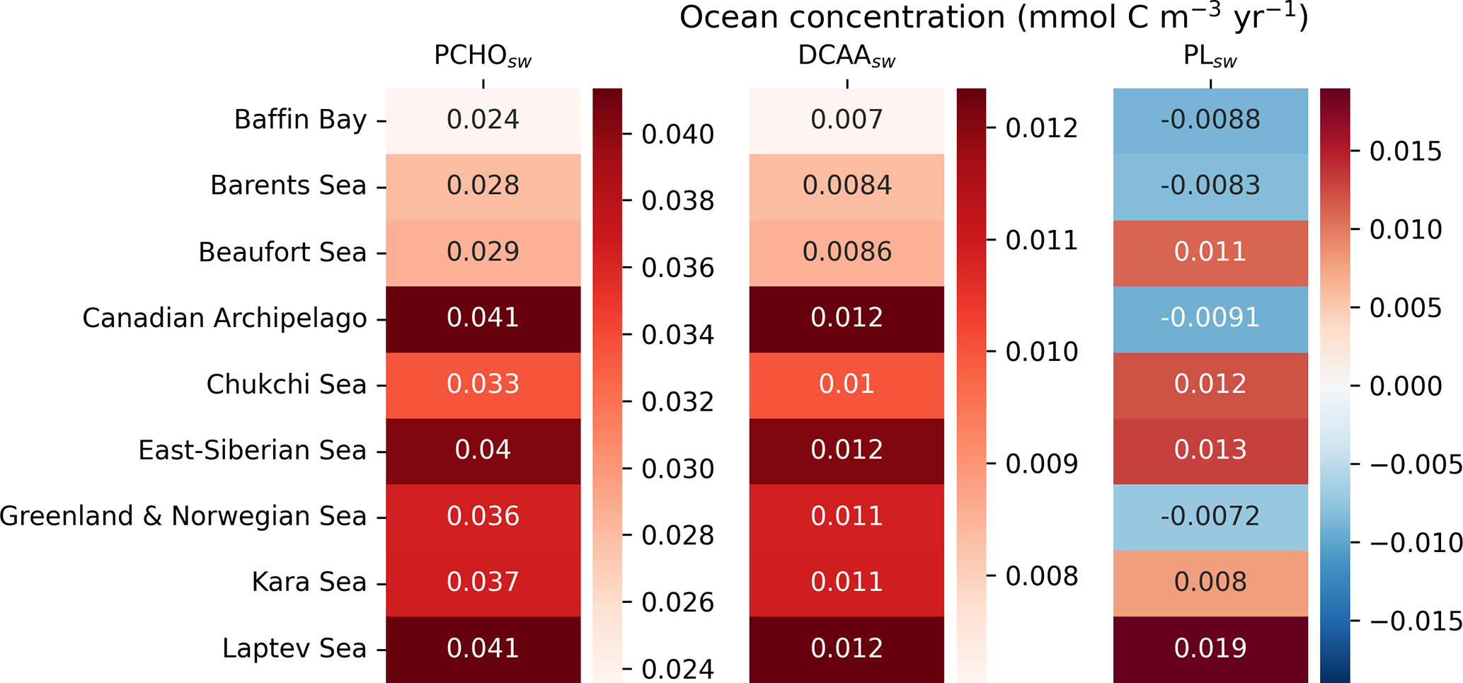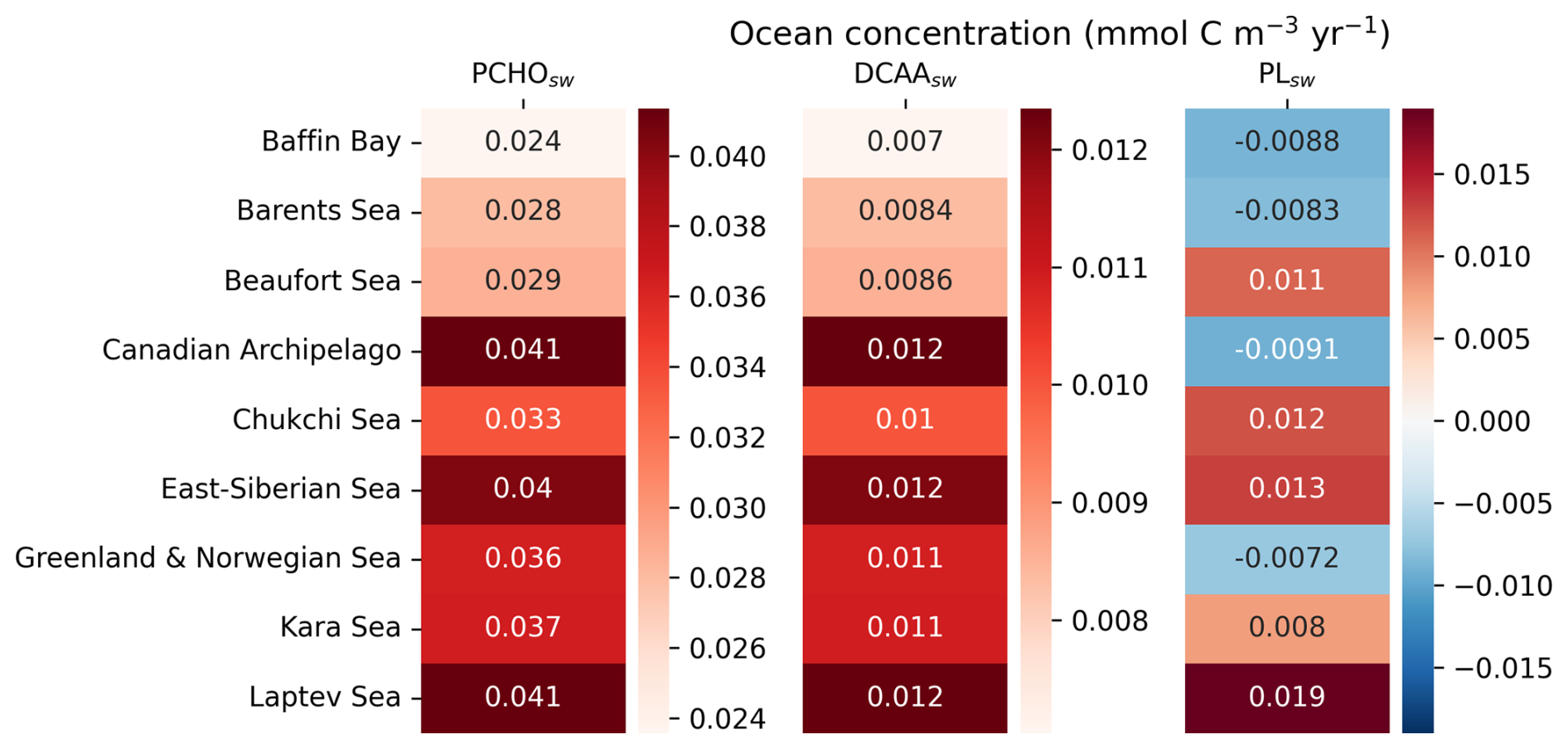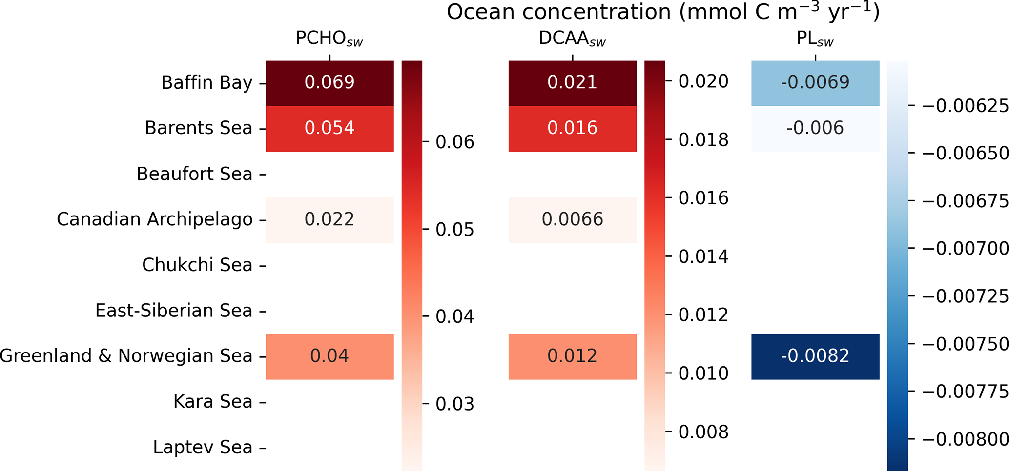 On the other hand, the extent of sea ice cover masks the marine biomolecules that potentially contribute to aerosols during spring (Fig. H1). Hence, in the Russian shelf, the trend is absent for all marine organic groups. Nonetheless, a strong increase in ocean carbon concentration occurs in Baffin Bay, the Canadian Archipelago, and the Nordic seas for PCHOsw and DCAAsw, largely exceeding summer values (see Fig. H2). Lastly, PLsw decreasing trend also persists in the Nordic Seas; however, somewhat weaker and stronger than in summer for the Barents and Greenland seas, respectively.