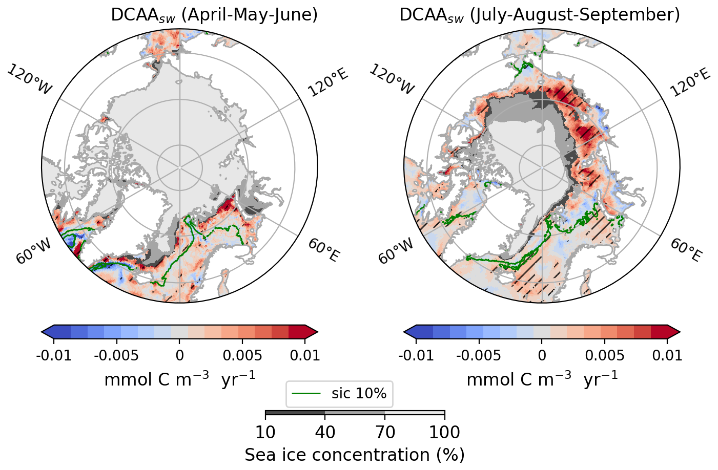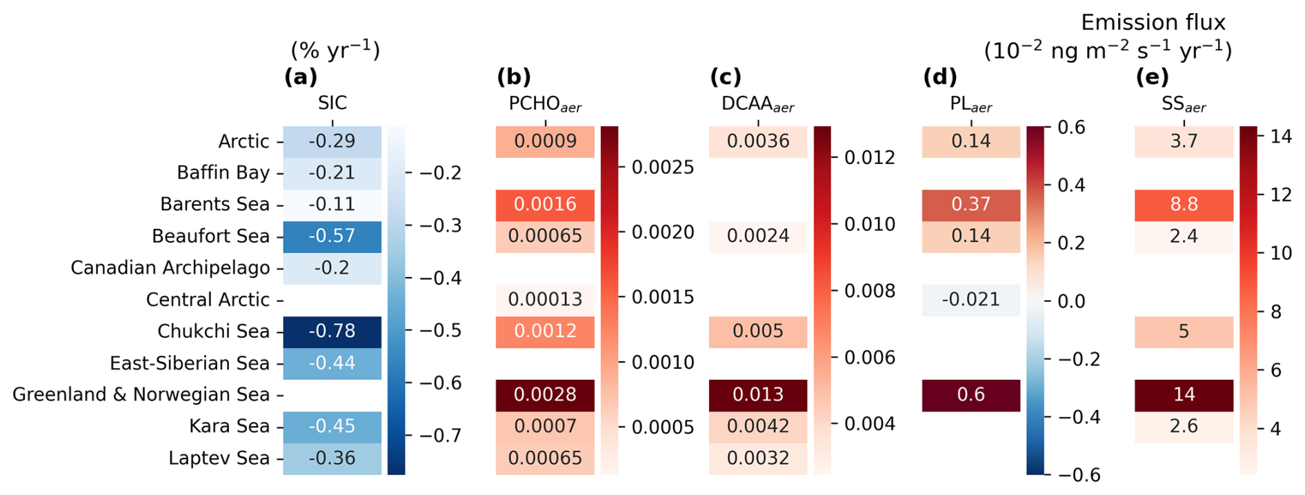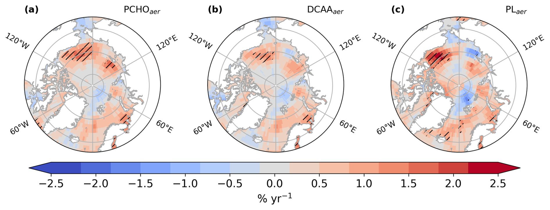 On the other hand, the extent of sea ice cover masks the marine biomolecules that potentially contribute to aerosols during spring (Fig. H1). Hence, in the Russian shelf, the trend is absent for all marine organic groups. Nonetheless, a strong increase in ocean carbon concentration occurs in Baffin Bay, the Canadian Archipelago, and the Nordic seas for PCHOsw and DCAAsw, largely exceeding summer values (see Fig. H2). Lastly, PLsw decreasing trend also persists in the Nordic Seas; however, somewhat weaker and stronger than in summer for the Barents and Greenland seas, respectively.