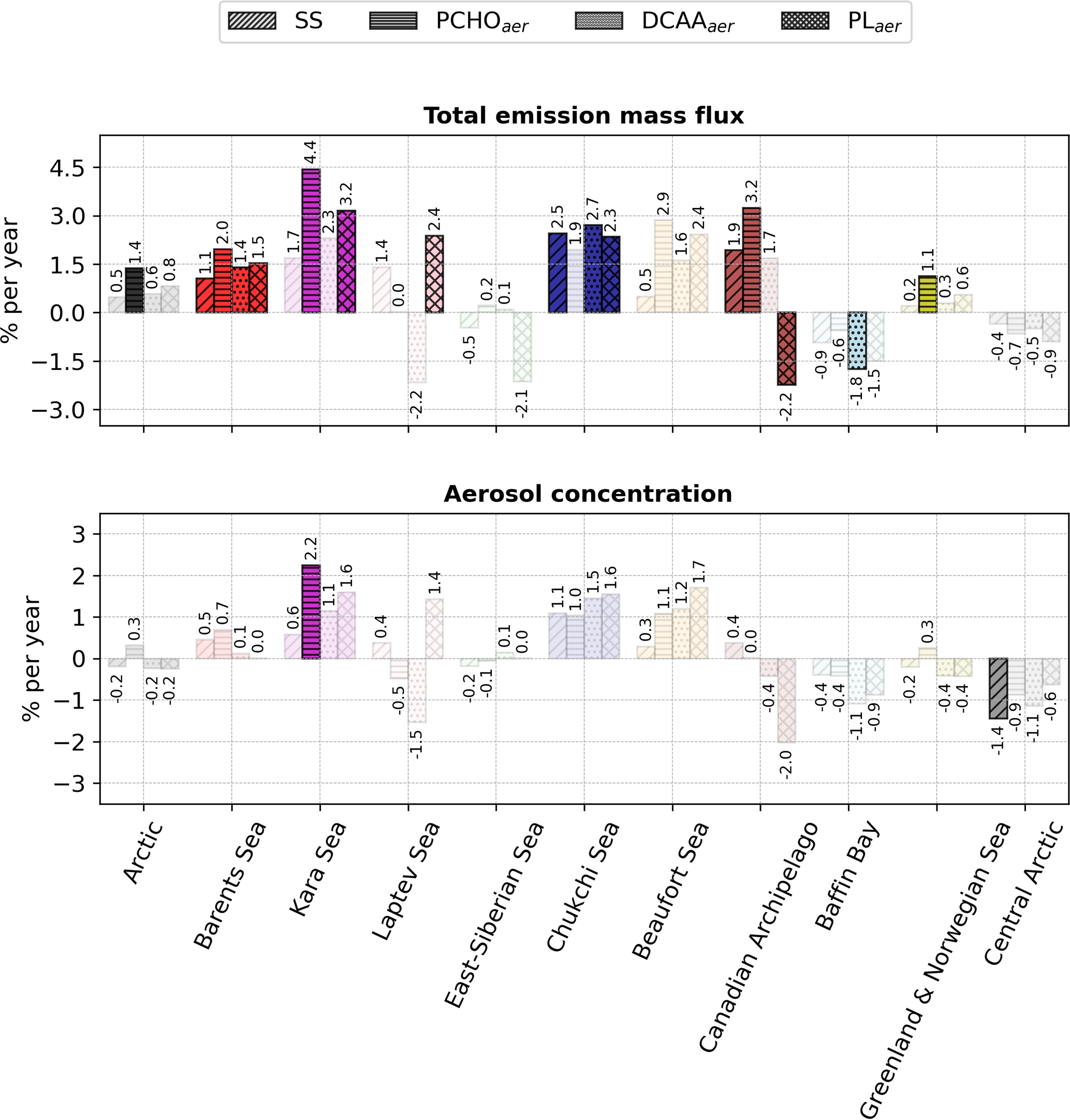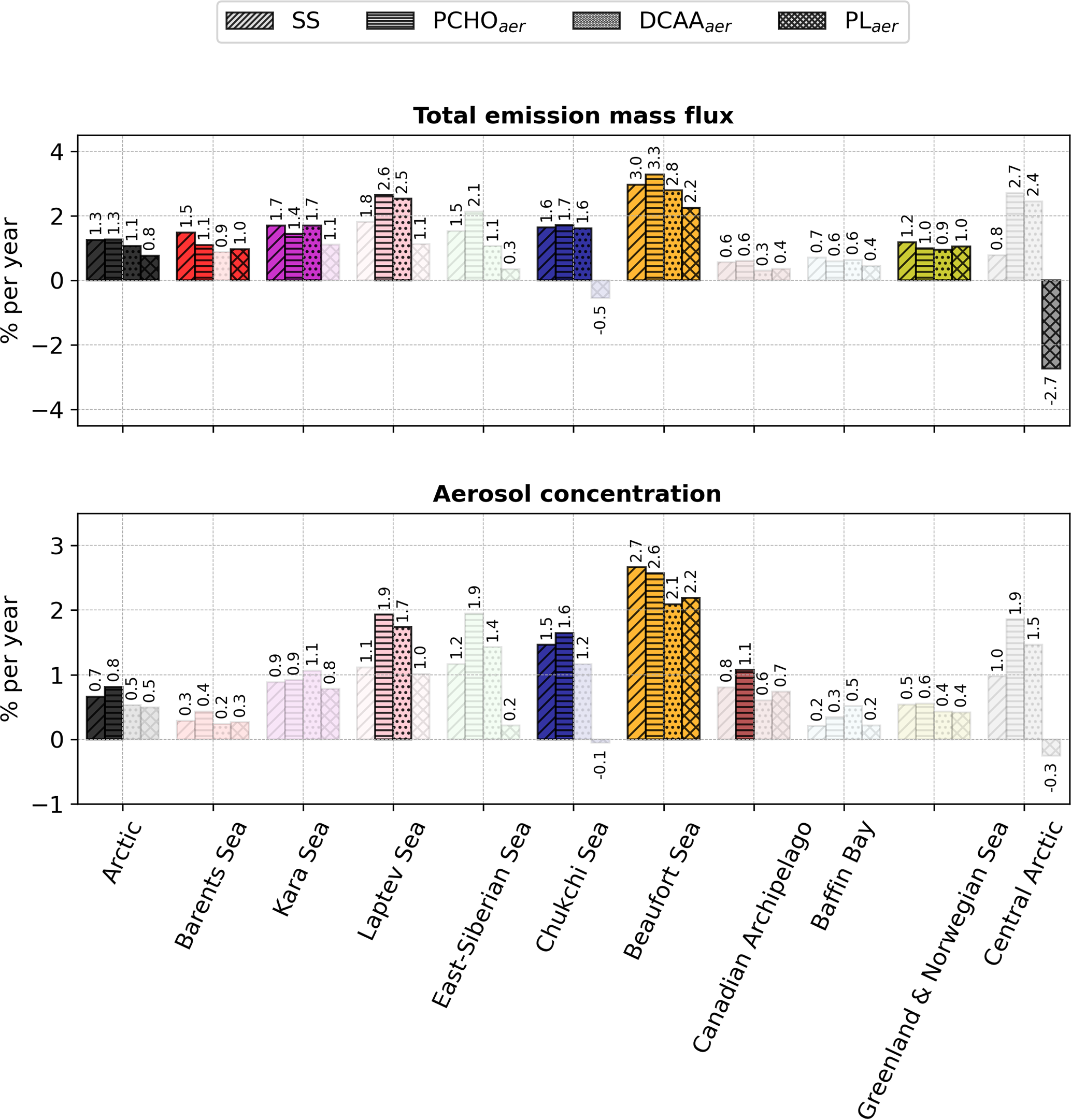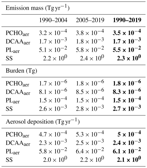 For the 15 year periods, a noticeable increment in the emissions is seen for all species (Table 1). PCHOaer presents the largest augment, with an 19.3 % increase from 1990–2004 to 2005–2019. Conversely, DCAAaer, PLaer, and SS growth is less strong, with values of 12 %, 13.9 % and 10.6 %, respectively. In our model, burden values also rise, although not as significant as the changes in emissions. For PCHOaer, the positive variations in the burden are also high (6.8 %) in contrast to a lower increase in DCAAaer and PLaer (4.5 % and 4.2 %). This indicates that an increment in aerosol sources will have a positive impact on the column burden. Similarly, the aerosol removal increases accordingly (Table 1). Wet deposition in stratiform clouds and in-cloud processes are the main processes that govern the loss of marine organics. For PCHOaer, DCAAaer and PLaer, the percentage of increase is about twice larger than for the burden (13.9 %, 8.9 % and 9.7 %, respectively). In contrast, the change in SS loss from the first half to the second half of the period is only slightly larger than the burden increase (8.8 %). Hence, estimated PMOA residence time in the atmosphere shortened for all species from 4 % to 6 %. The noticeable differences between PLaer, DCAAaer, and PCHOaer are primarily attributed to the variations in the geographical distribution (Fig. 4) and seasonality of aerosol fluxes (see next section) in the Arctic.