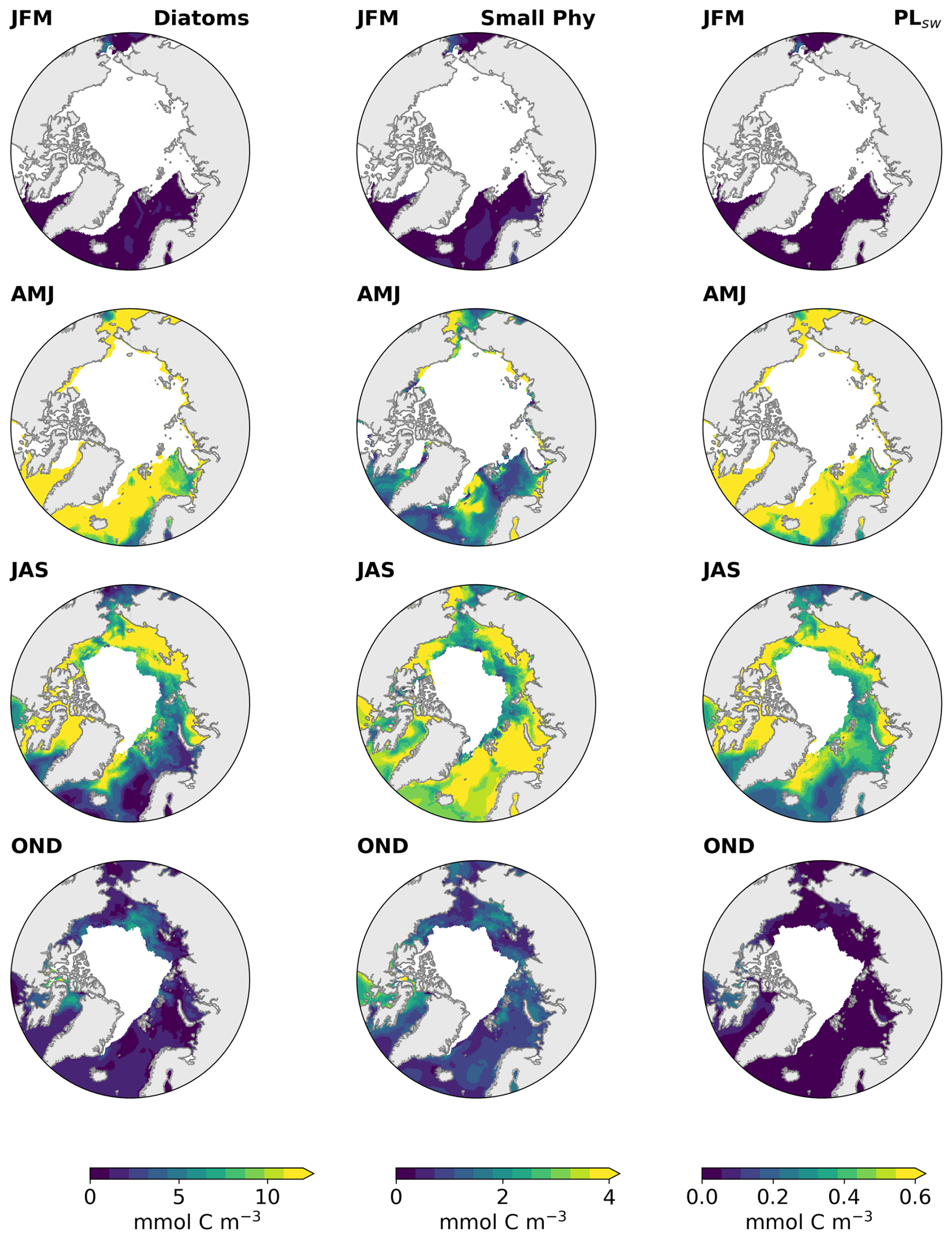 The dominance of the biomolecules in the ocean during spring and summer occurs in response to the higher phytoplankton carbon concentration in the water during this period. After rapid nutrient consumption during phytoplankton growth, the bloom decays primarily due to nutrient depletion. Among the modelled phytoplankton groups, diatoms contribute to the majority of the exuded DOC in the Arctic, especially during the early stage of the bloom (Fig. B1).