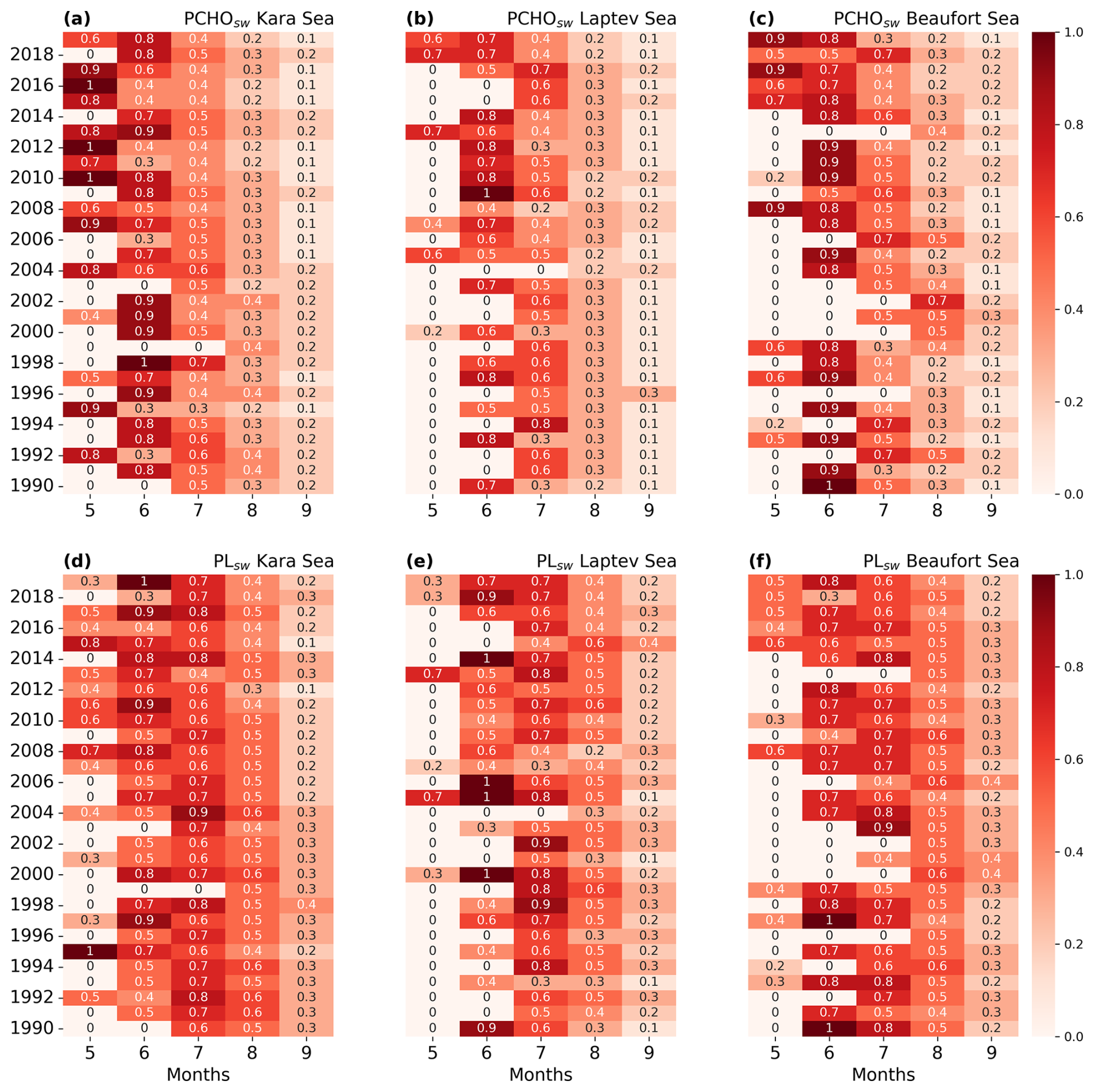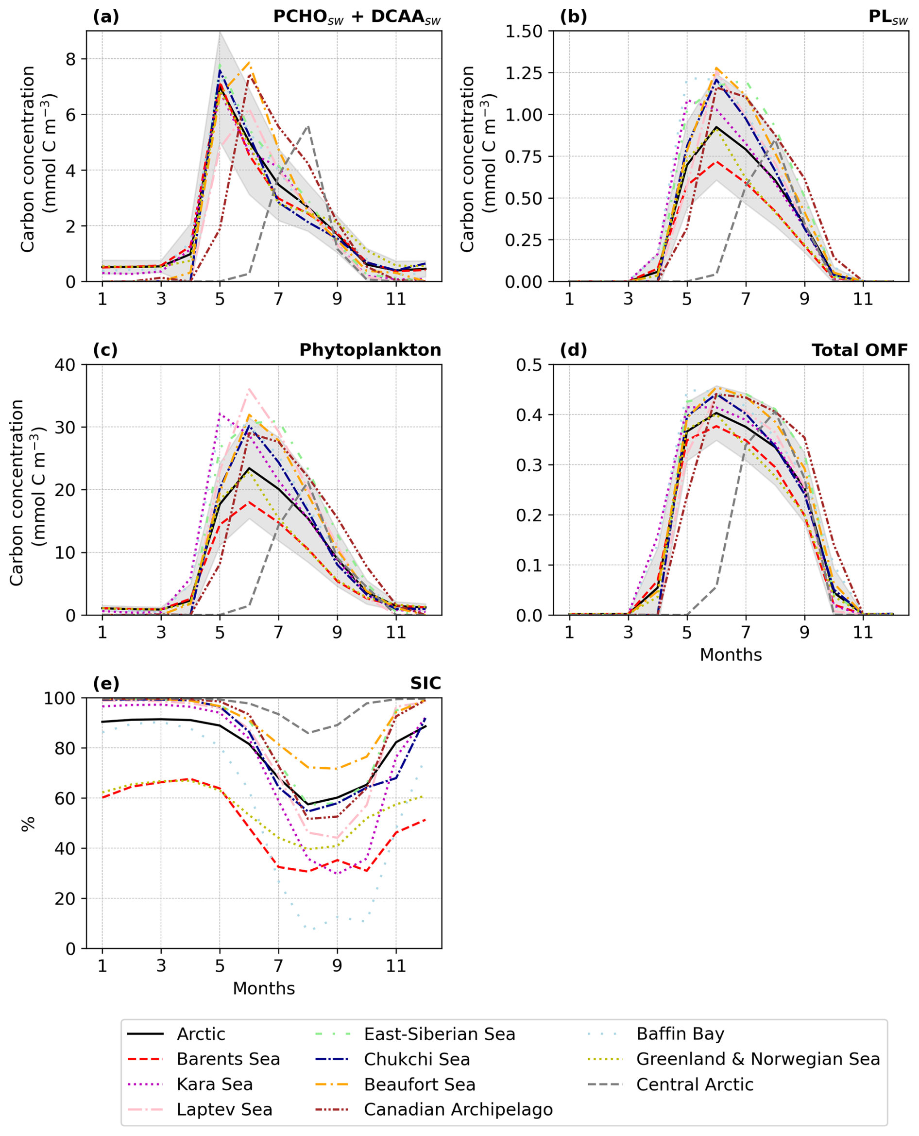 Sea ice is a controlling factor in the initiation of the bloom (Ardyna and Arrigo2020), as well as the magnitude of the biomolecule production. For instance, in the Central Arctic, where light is the most limiting factor (Schourup-Kristensen et al.2018) with sea ice only partially retreating by mid-summer alongside low nutrient availability, a less prominent late bloom shifts the initiation of phytoplankton carbon release to May (see Fig. B2b and c). Conversely, the Greenland, Norwegian, and Barents Seas have the lowest sea ice coverage among Arctic subregions (see Fig. B2e) and lower phytoplankton carbon concentrations (see Fig. B2c). These seas are also strongly influenced by the lateral transport of nutrients from the North Atlantic Ocean (Harrison et al.2013). Other regions such as the Chukchi Sea, the Russian shelf, the Beaufort Sea and the Canadian Archipelago are seasonally sea ice covered (Fig. B2e). In the coastal zones of these regions, sea ice cracks and melts, which, along with local factors, rapidly trigger marine primary production. In addition, the Eastern Siberian, Southern Beaufort, Laptev, and Kara Seas are characterised by a strong land influence, and higher concentrations of biomolecules are attributed to riverine nutrient supplies (Miquel2001; Wang et al.2005; Karlsson et al.2011; Oziel et al.2025). Moreover, ice-edge blooms and high nutrients near shore in ice-free conditions are the sites with the highest PLsw production (Fig. 2c), suggesting that its spatial distribution is highly sensitive to sea ice dynamics.