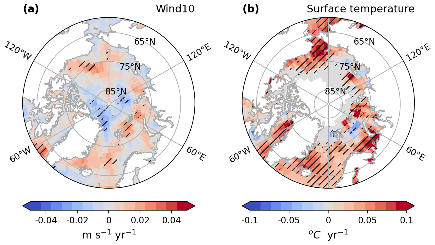 Figure 5a shows the average 10 m winds for the Arctic subregions. In the neighbouring waters of the North Atlantic Ocean, the Baffin Bay, the Barents and Chukchi seas, winds follow the seasonal meteorological conditions, with intensified velocities in the winter months. For the inner Arctic seas, patterns are more heterogeneous. The Central Arctic, Kara Sea, Beaufort Sea and Canadian Archipelago do not present a pronounced seasonality, whereas the Laptev and East-Siberian winds tend to be higher in summer.
