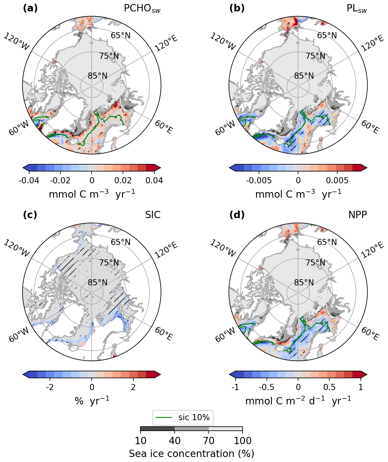 Figure 6Arctic trends of (a) PCHOsw and (b) PLsw ocean concentration, (c) sea ice concentration and (d) net primary production from FESOM-REcoM model for July–August–September of the simulated period 1990–2019. The hatching indicates the areas over which trends are significant (Mann–Kendall test, p-value < 0.05). The green contour line depicts the average season 10 % sea ice concentration. The minimum seasonal SIC for the period occurred in September 2012, and it is also represented in shaded grey.