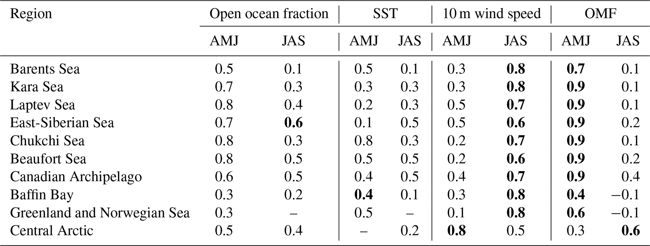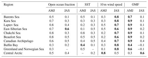 Table 2Spearman correlation coefficients between daily total PMOA emission flux and emission drivers for the Arctic subregions over April–May–June (AMJ) and July–August–September (JAS). Only statistically significant cases (p-value < 0.05) are shown. The absolute maximum values per region are highlighted in bold.