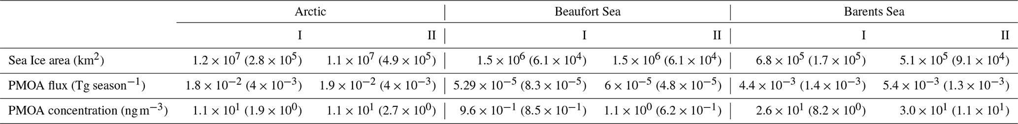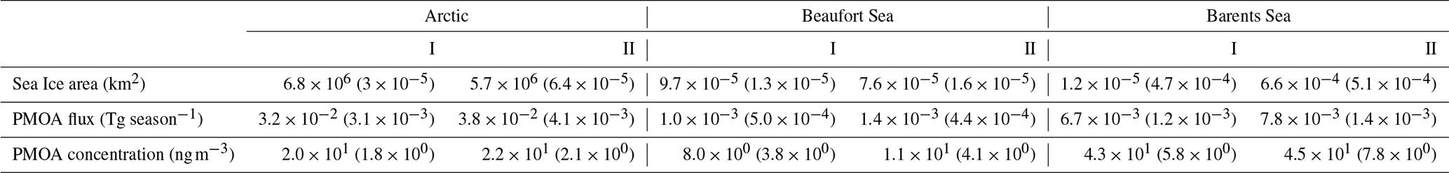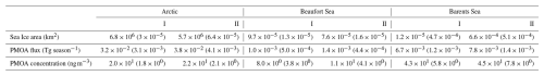 Table 3Values of sea ice area, total emission mass flux and near-surface average PMOA concentration over the Arctic and Arctic subregions Beaufort Sea and Barents Sea analysed in Fig. 7 for 15 year periods, 1990–2004 (I) and 2005–2019 (II) for July–August–September. Seasonal emission totals are derived by adding daily values throughout the season across all grid cells in the region. The standard deviation of the multi-year average is shown in parentheses.