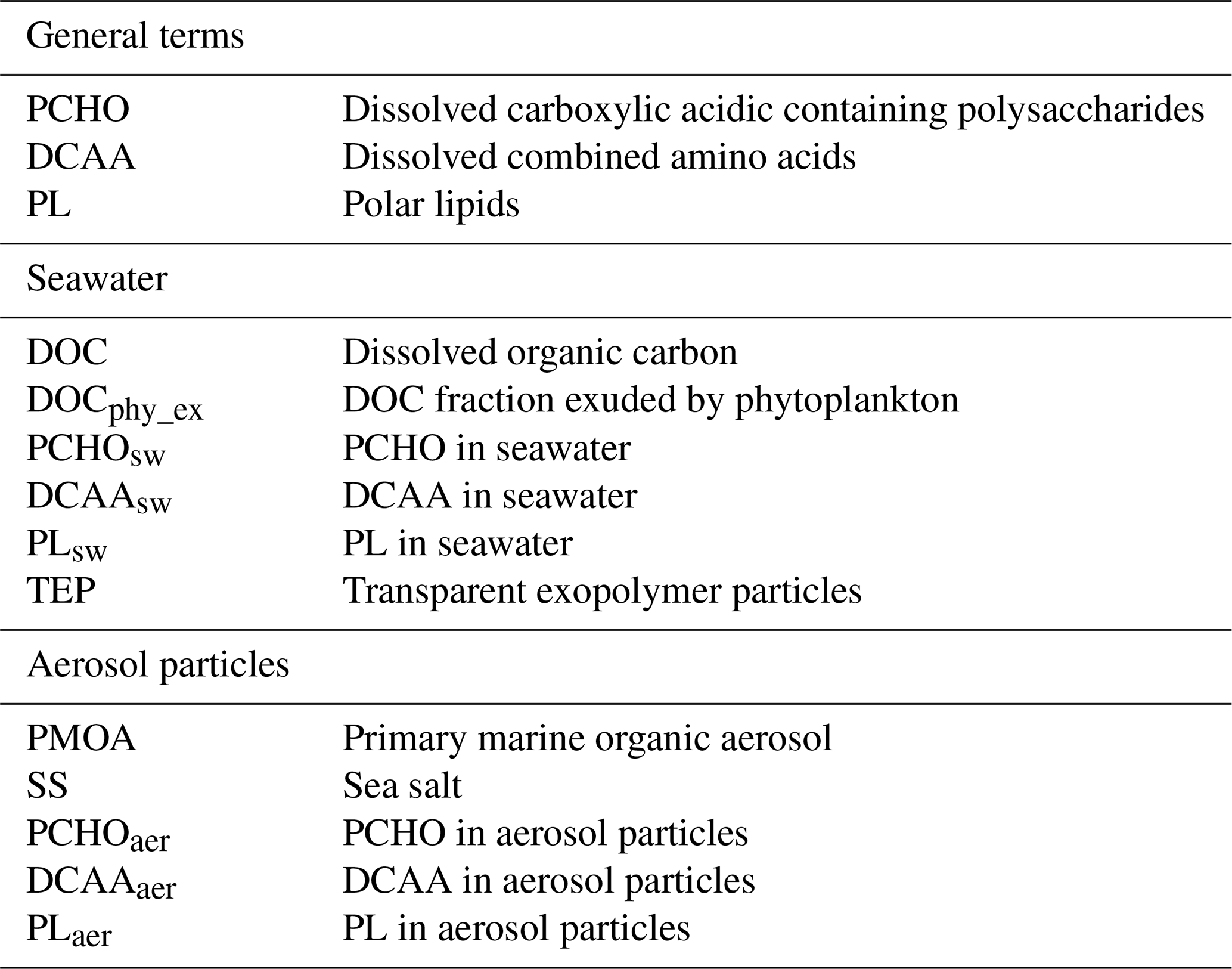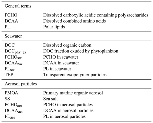 The representation of PMOA emissions in aerosol–climate models considers the same principles found in observations. Available emission parametrizations for estimating the organic mass fraction in sea spray, follow either a chl a based empirical formulation (O'Dowd et al.2008; Gantt et al.2011; Rinaldi et al.2013) or an organic-class-resolved approach that accounts for the physicochemical characteristics of ocean biomolecules (Burrows et al.2014). Both types of schemes have been implemented and evaluated in global models (Gantt and Meskhidze2013; Huang et al.2018; Zhao et al.2021; Leon-Marcos et al.2025). Nonetheless, the analysis of the PMOA as species-resolved organic groups (e.g, polysaccharides, proteins, and lipids) could provide additional evidence of potential differences in marine organic aerosol abundance. Recent findings from Arctic measurements confirm the high enrichments of carbohydrates in aerosols, which were also detected in the surface microlayer of the marginal ice zone and in aged melt ponds (Zeppenfeld et al.2023). This supports previous findings by Russell et al. (2010) of saccharide compounds in Arctic marine aerosols. Similarly, a notable contribution of glucose, which could be considered as a proxy for ice nucleating activity (Zeppenfeld et al.2019), has been measured in sea spray aerosol north of 80° N (Rocchi et al.2024). In addition to carbohydrate-like substances, Hawkins and Russell (2010), also found evidence of marine proteinaceous material in aerosol particles. Lipid-like molecules (e.g. n-alkanes and fatty acids) have also been analysed in the Bering Sea, with significant contributions to marine aerosols in summer (Hu et al.2023). Therefore, the critical role of PMOA emissions, transport patterns and evolution under the rapidly changing climate should be thoroughly studied for individual species.