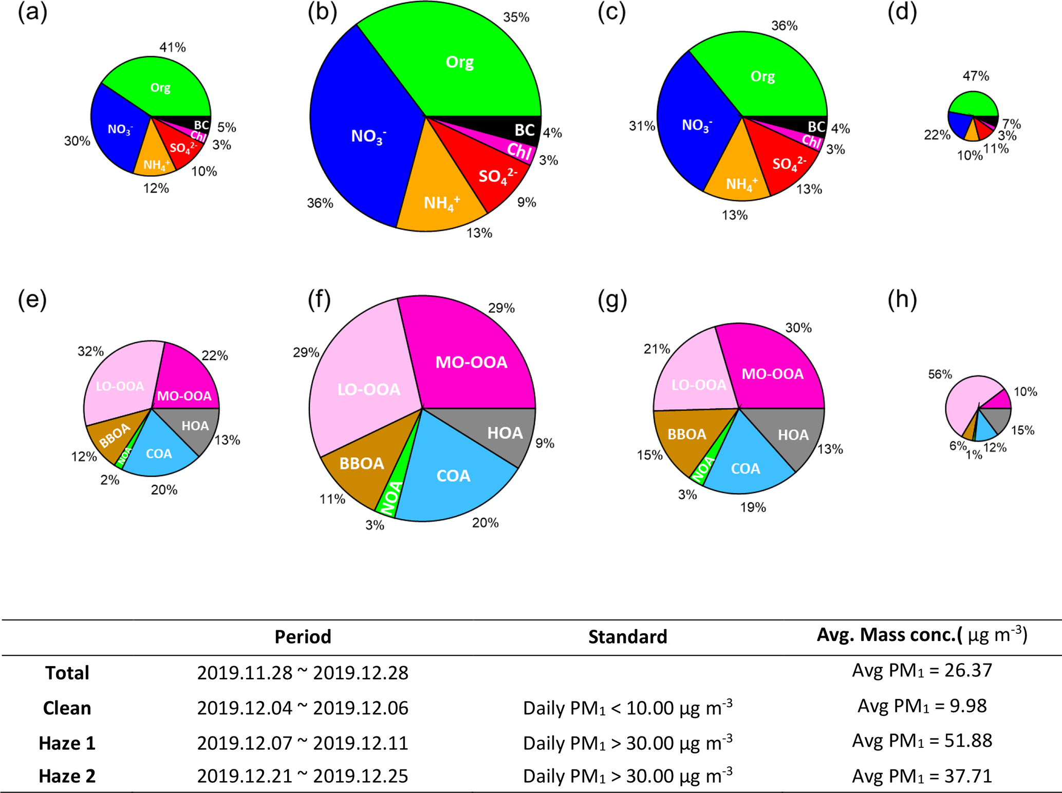 Figure 1Compositional pie charts of PM1 species for (a) the entire study period, (b) haze period 1, (c) haze period 2, and (d) a clean period; and of each OA source for (e) the entire study period, (f) haze period 1, (g) haze period 2, and (h) the clean period. Table: Standard and average PM1 mass concentrations during the entire study period, haze period 1, haze period 2, and the clean period.