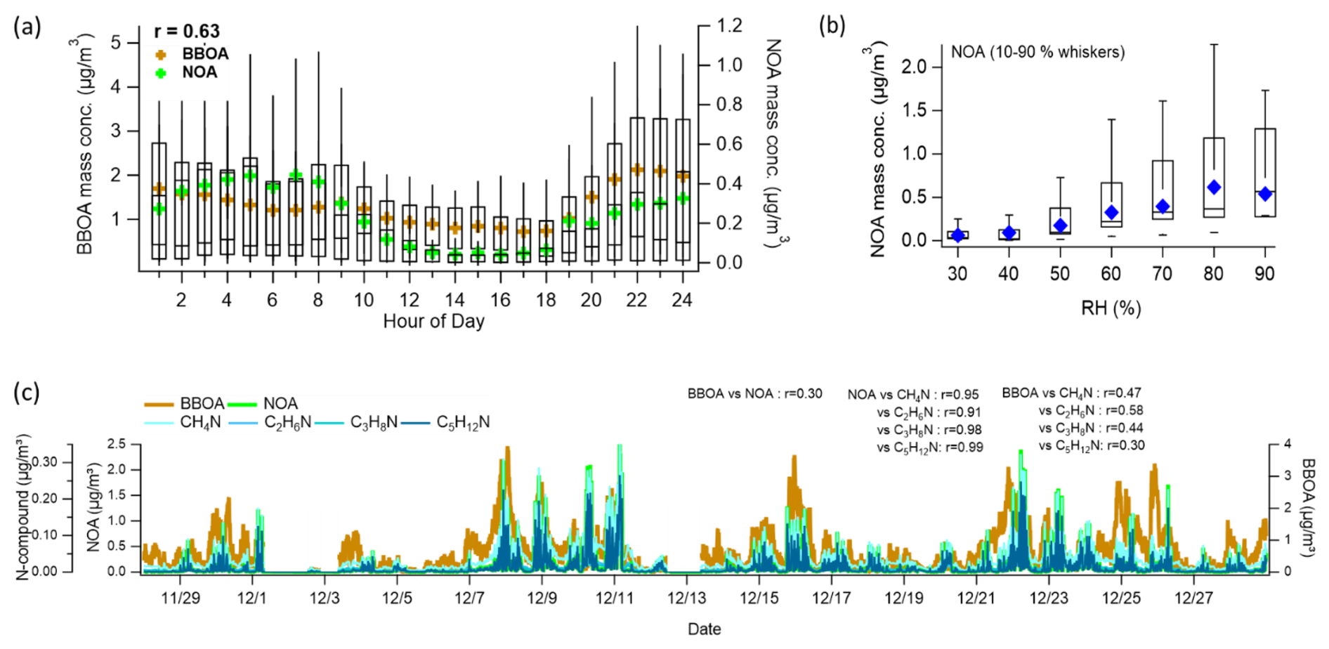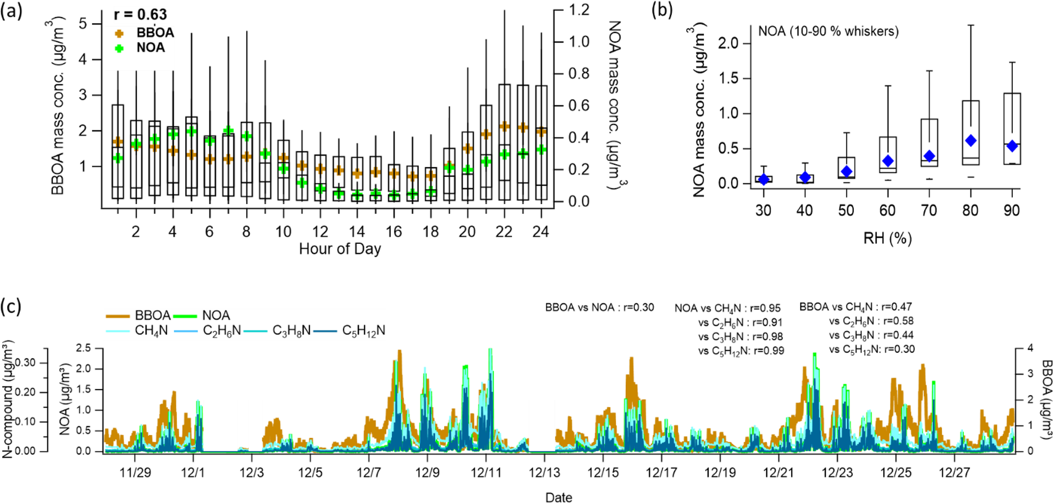 Figure 2(a) Diurnal mean profiles of NOA and BBOA. Whiskers denote the 90th and 10th percentiles; box edges represent the 75th and 25th percentiles; the horizontal line indicates the median, and the colored marker shows the mean. The diurnal correlation between NOA and BBOA mean values is 0.63. (b) Relative humidity (RH)-binned nighttime (19:00–05:00) profile of NOA. Box and whisker definitions are the same as in panel (a). (c) Time series of NOA, BBOA, and amine-related ions (CH4N+, C2H6N+, C3H8N+, C5H12N+), along with their correlations with NOA and BBOA.