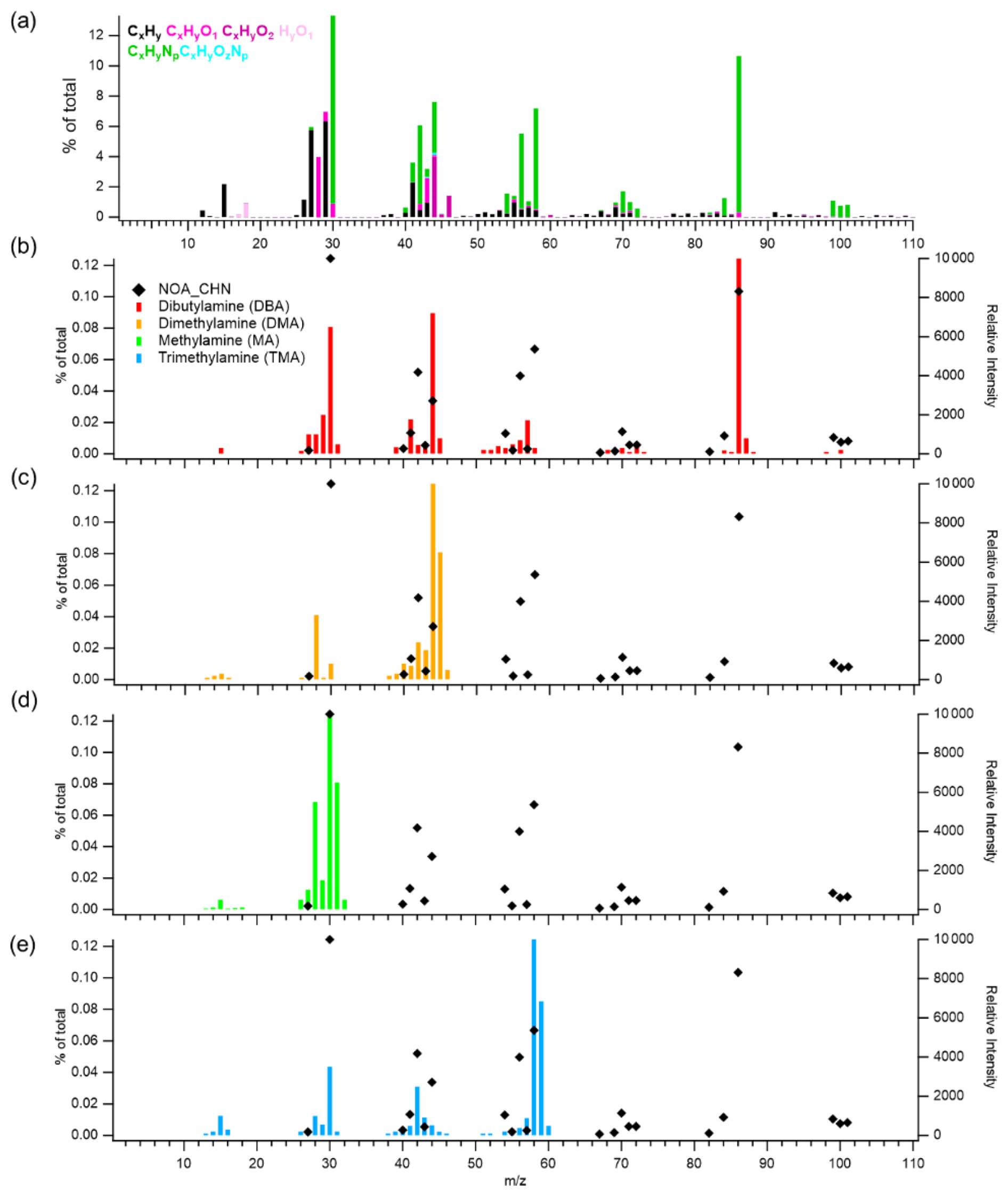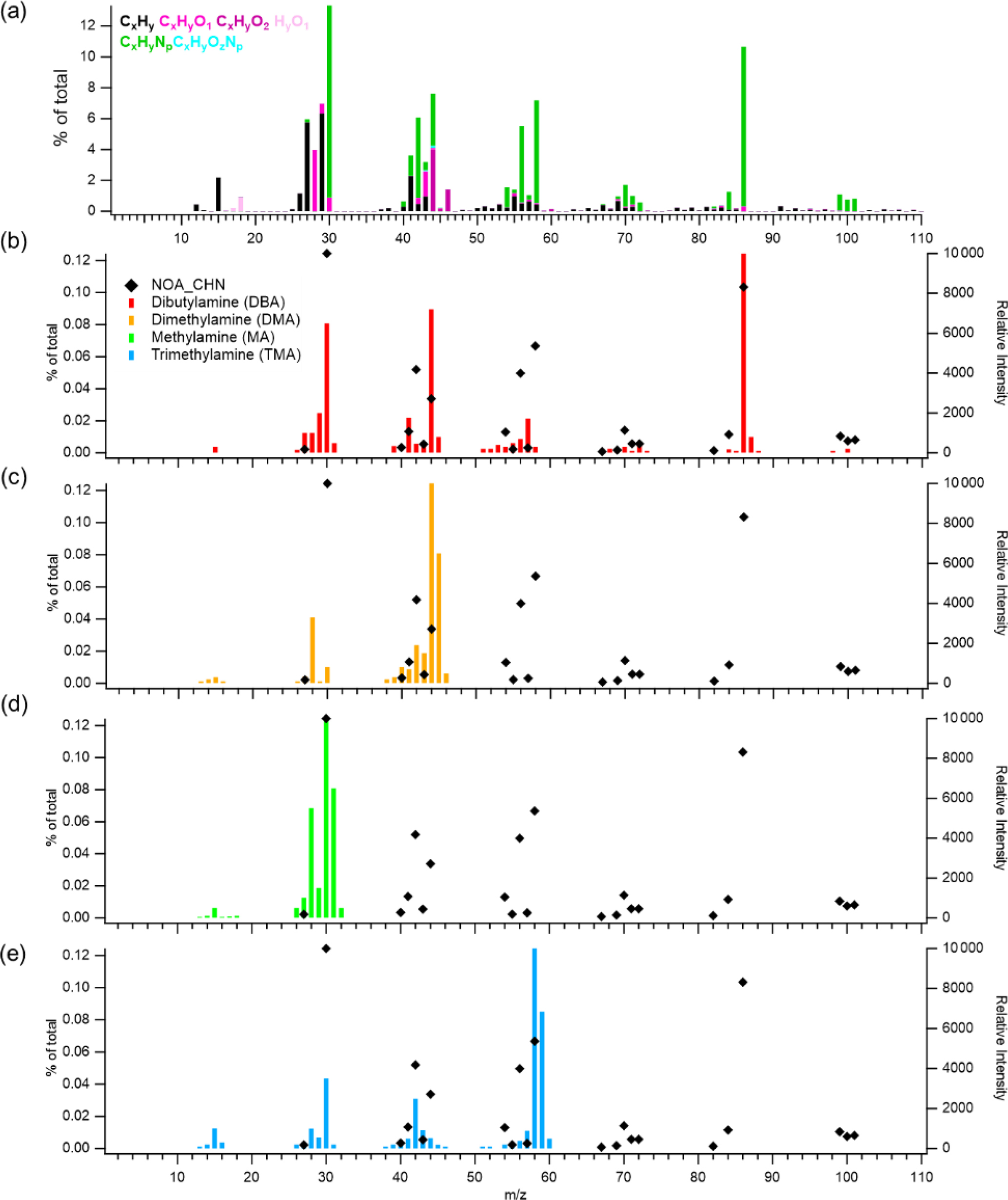 Figure 3Mass spectra of (a) the NOA factor resolved by PMF analysis in this study, and reference spectra of amines from the NIST library: (b) dibutylamine (DBA), (c) dimethylamine (DMA), (d) methylamine (MA), and (e) trimethylamine (TMA). In panels (b)(e), the left y axis indicates the contribution of CHN-containing ions in the NOA factor (% of total), while the right y axis shows the relative intensity of each compound's mass spectrum from the NIST library.