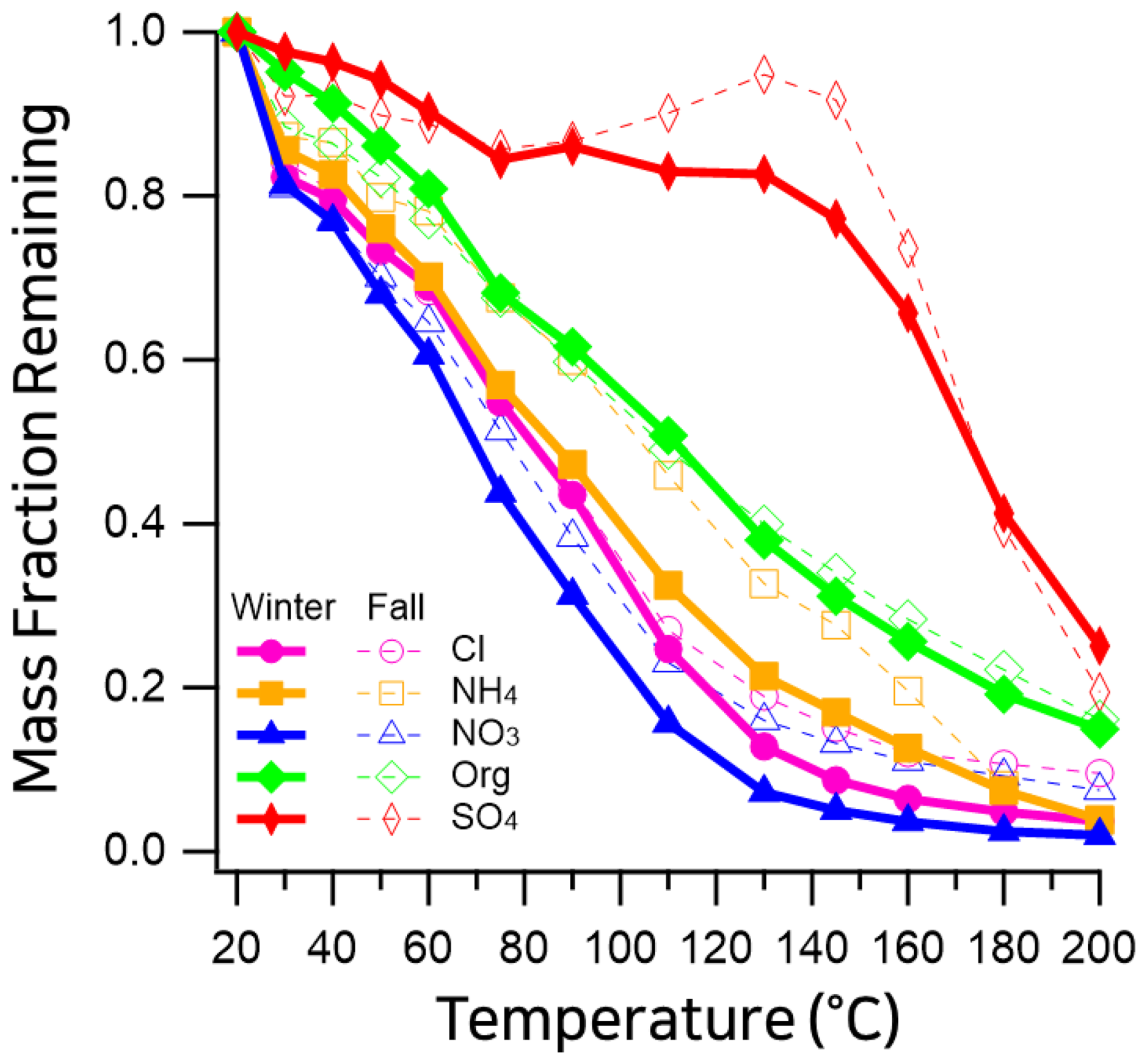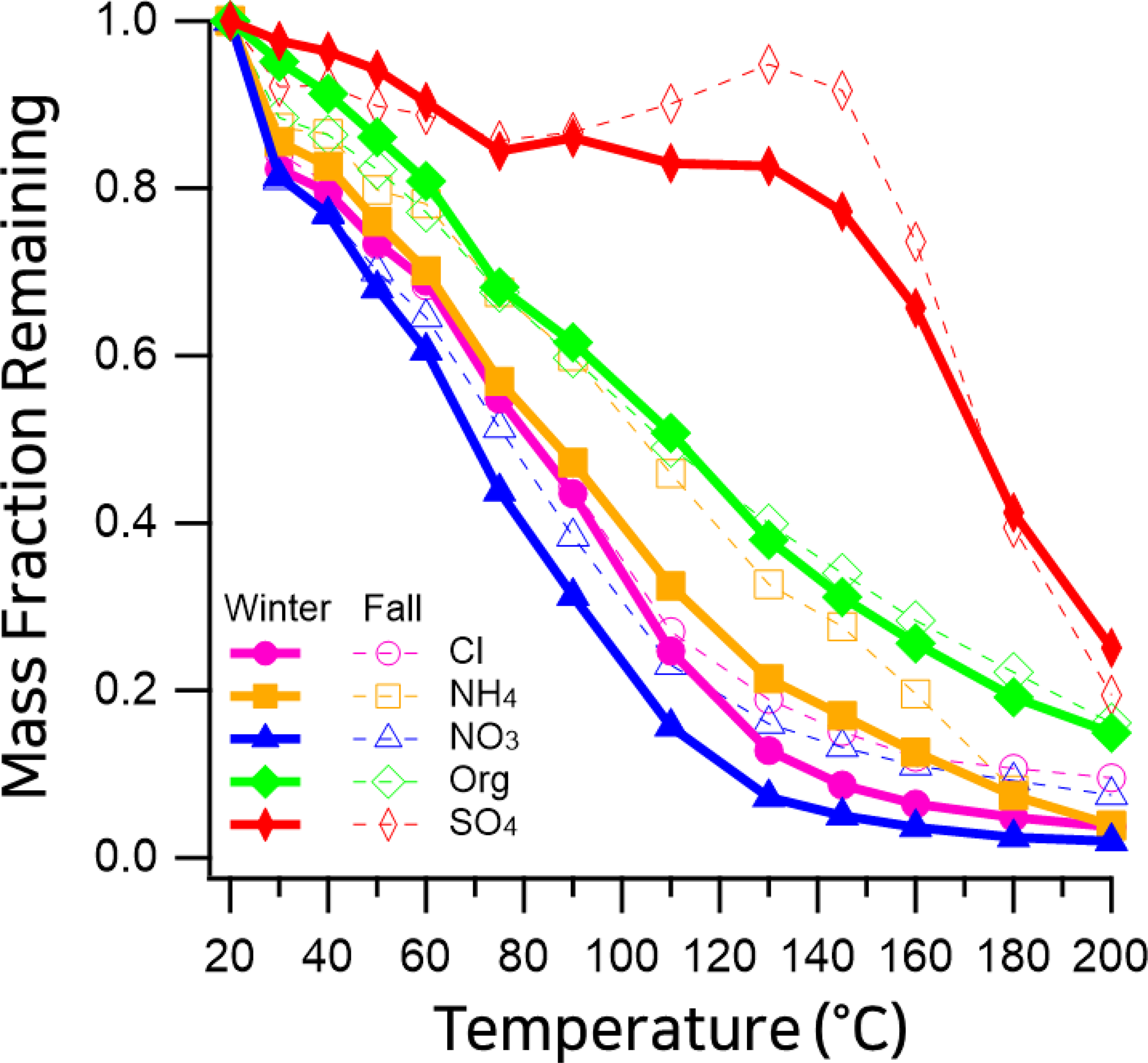 Figure 4Mass fraction remaining (MFR) of non-refractory (NR) aerosol species measured in Seoul using a thermodenuder coupled to a high-resolution time-of-flight aerosol mass spectrometer (HR-ToF-AMS). Winter 2019 (this study; dashed) is compared with fall 2019 (previously reported; solid) (Jeon et al., 2023).Species include organics (magenta), nitrate (blue), sulfate (orange), ammonium (green), and chloride (red).