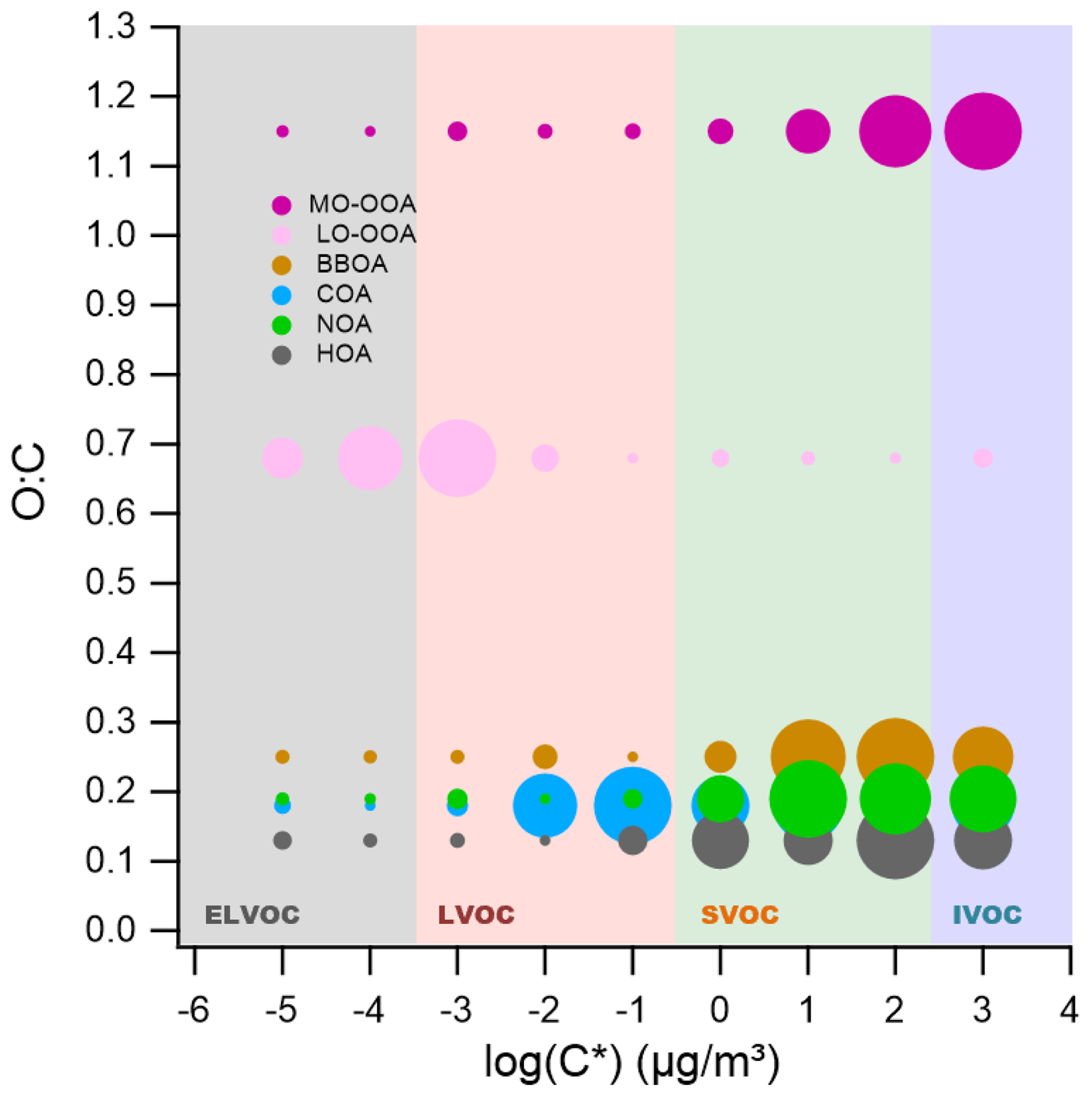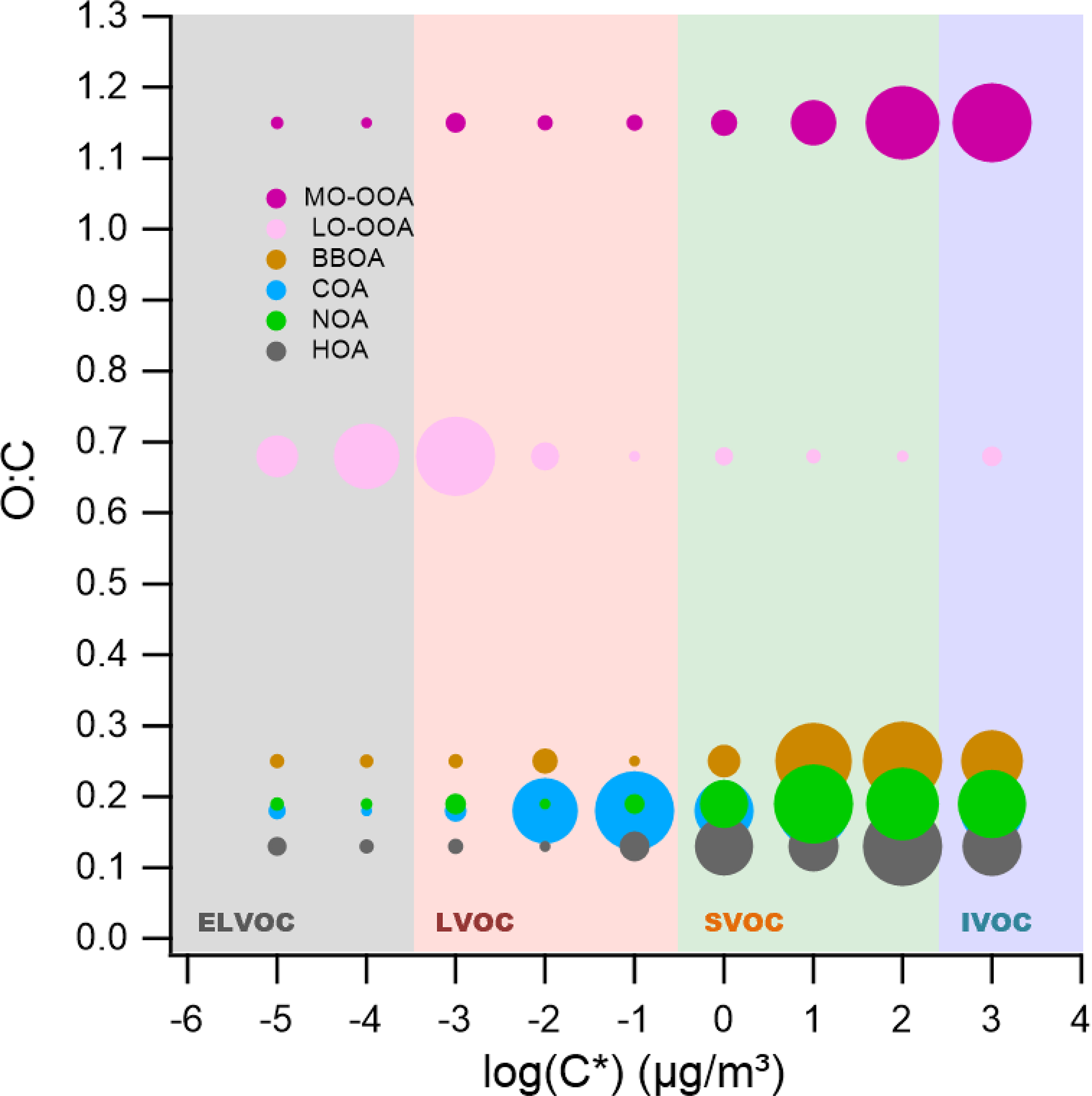 Figure 5Two-dimensional volatility basis set (2D-VBS) representation of organic aerosol (OA) sources identified in winter 2019 in Seoul. The plot illustrates the relationship between the oxygen-to-carbon (O:C) ratio and the effective saturation concentration (C*) for each OA source resolved via positive matrix factorization (PMF). Solid circles represent the volatility distribution across C* bins, with marker size proportional to the mass fraction within each bin for the given source. Shaded regions correspond to different volatility classes: extremely low-volatility organic compounds (ELVOCs), low-volatility organic compounds (LVOCs), semi-volatile organic compounds (SVOCs), and intermediate-volatility organic compounds (IVOCs), delineated by their C* values.