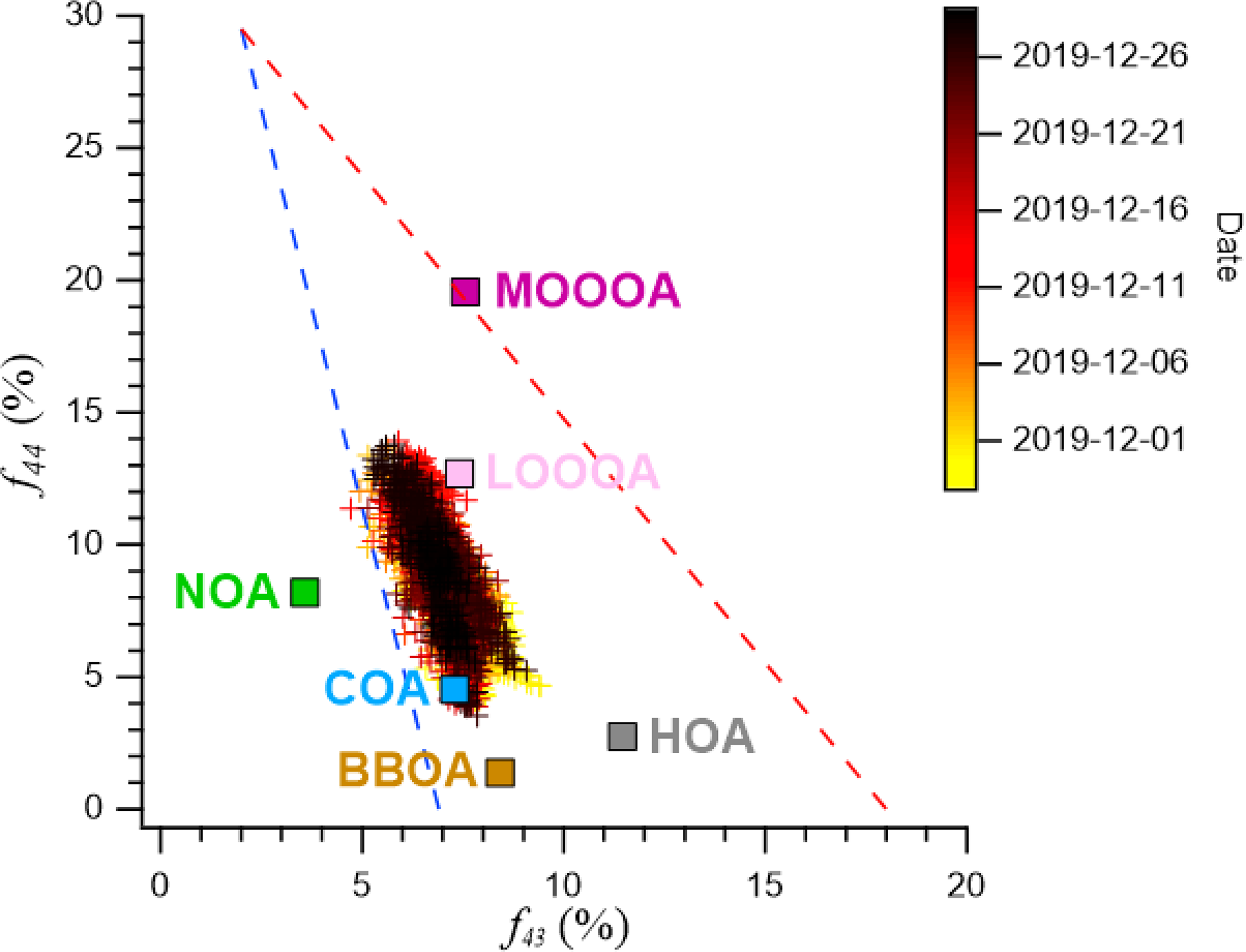 Figure 6Scatterplot of f44 (CO2+) versus f43 (C2H3O+). for the measured organic aerosol. The data points are color-coded by date to illustrate the temporal variation in OA composition throughout the observation period. The separated OA factors (HOA, COA, BBOA, NOA, LO-OOA, and MO-OOA) are also shown to enable comparison of source contributions and oxidation characteristics. The dashed line represents the typical f60 threshold associated with biomass-burning influence, while the triangular boundary indicates the conventional oxidative aging trend in the f44–f60 space.