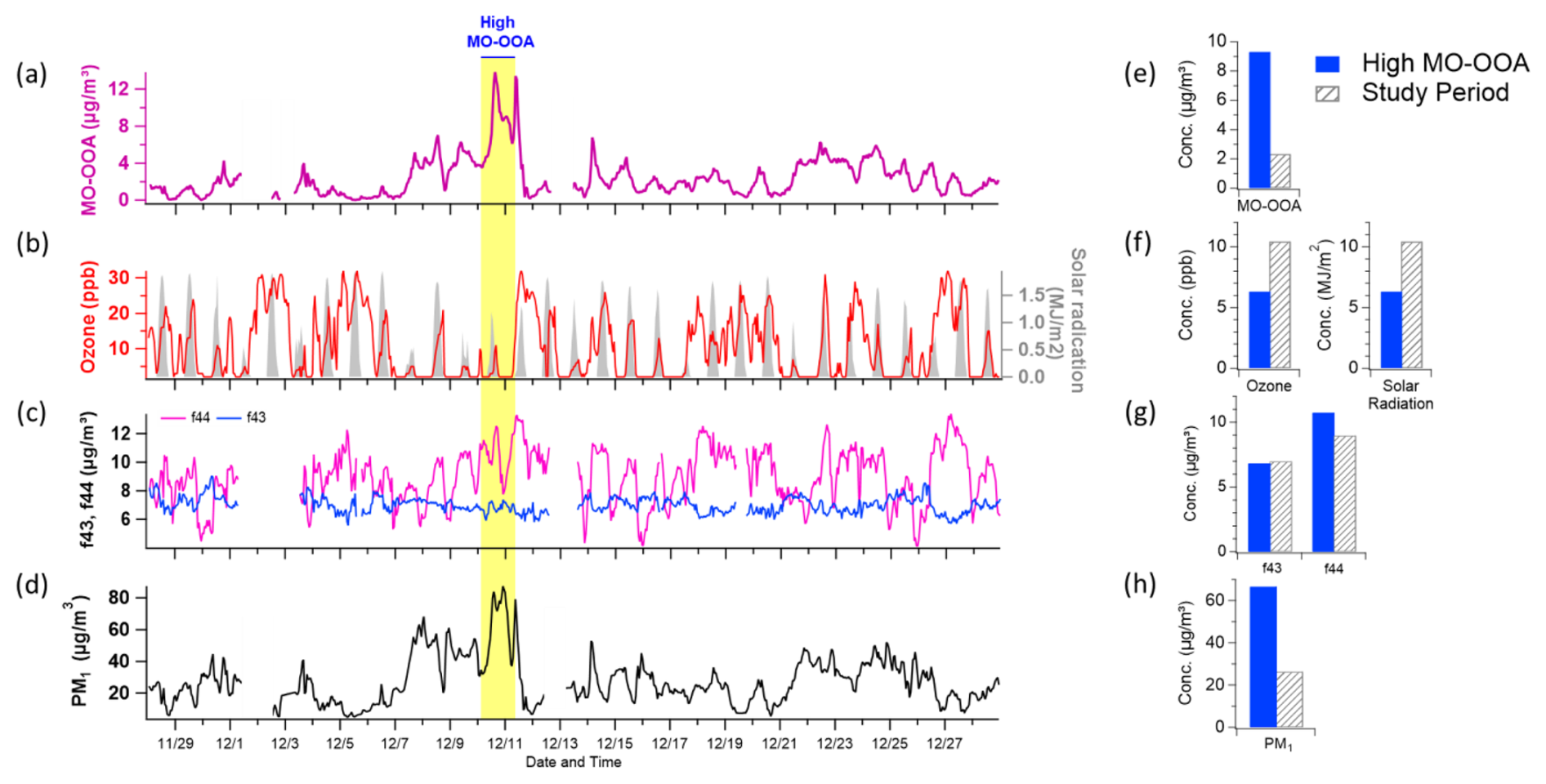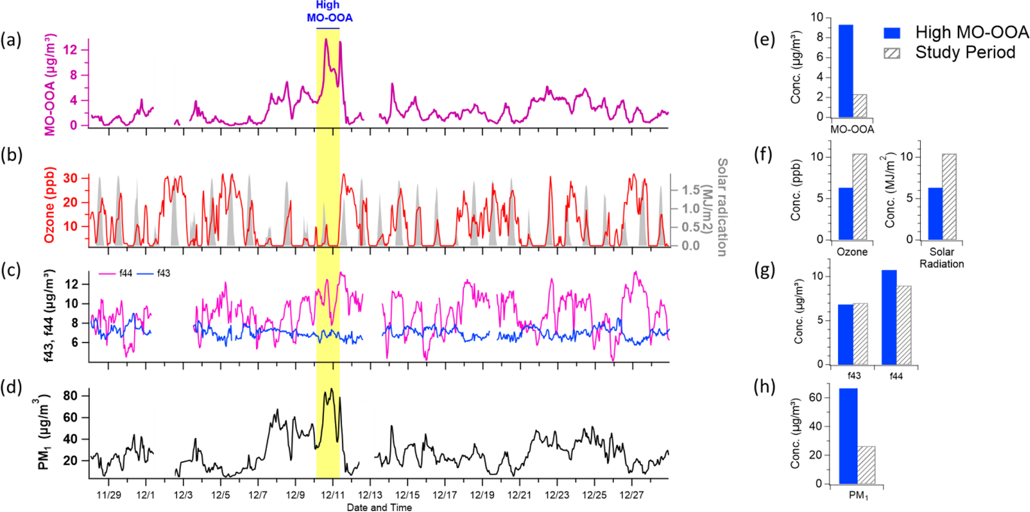 Figure 7Time series plots of (a) MO-OOA concentration, (b) ozone (O3) and solar radiation, (c) f44 and f43 (indicative of oxidation state), and (d) total PM1 concentration. The period characterized by elevated MO-OOA levels is highlighted in bright yellow. Panels (e)(f) present comparative distributions of these variables – MO-OOA, O3 and solar radiation, f44 and f43, and PM1 – between the high MO-OOA period (shaded in blue) and the entire measurement period (indicated by gray hatching).