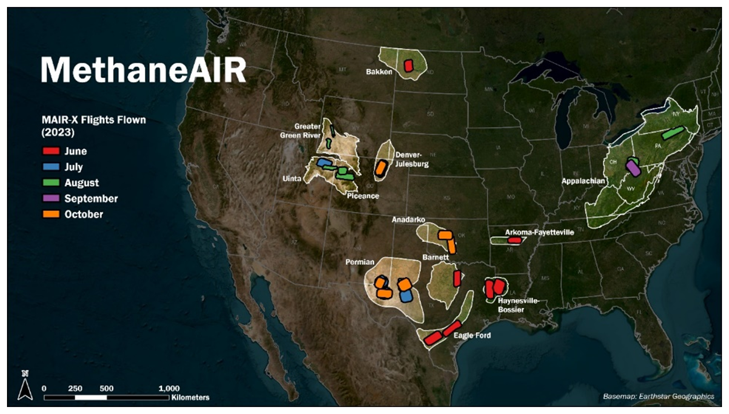 MethaneSAT was a satellite mission (launched on 4 March 2024) designed to provide quantitative data on total regional methane emissions, with a goal of mapping emissions in regions accounting for over 80 % of global oil and gas production (MethaneSAT, 2024). MethaneAIR is an airborne precursor instrument with similar spectroscopy to MethaneSAT (Chan Miller et al., 2024; Staebell et al., 2021). In 2023, MethaneAIR was flown on a modified Lear 35 jet operating at about 12 km altitude to map methane emissions from major oil and gas producing regions in the United States. Compared to ground-based measurement techniques, high altitude aerial systems like MethaneAIR can cover much larger areas in less time, and are not limited by site accessibility, making them particularly useful for assessing and comparing methane emissions at the basin-level. MethaneAIR was designed to detect and quantify both area aggregates of dispersed emission sources as well as high-emitting point sources, measuring total regional emissions with high precision and spatial resolution.