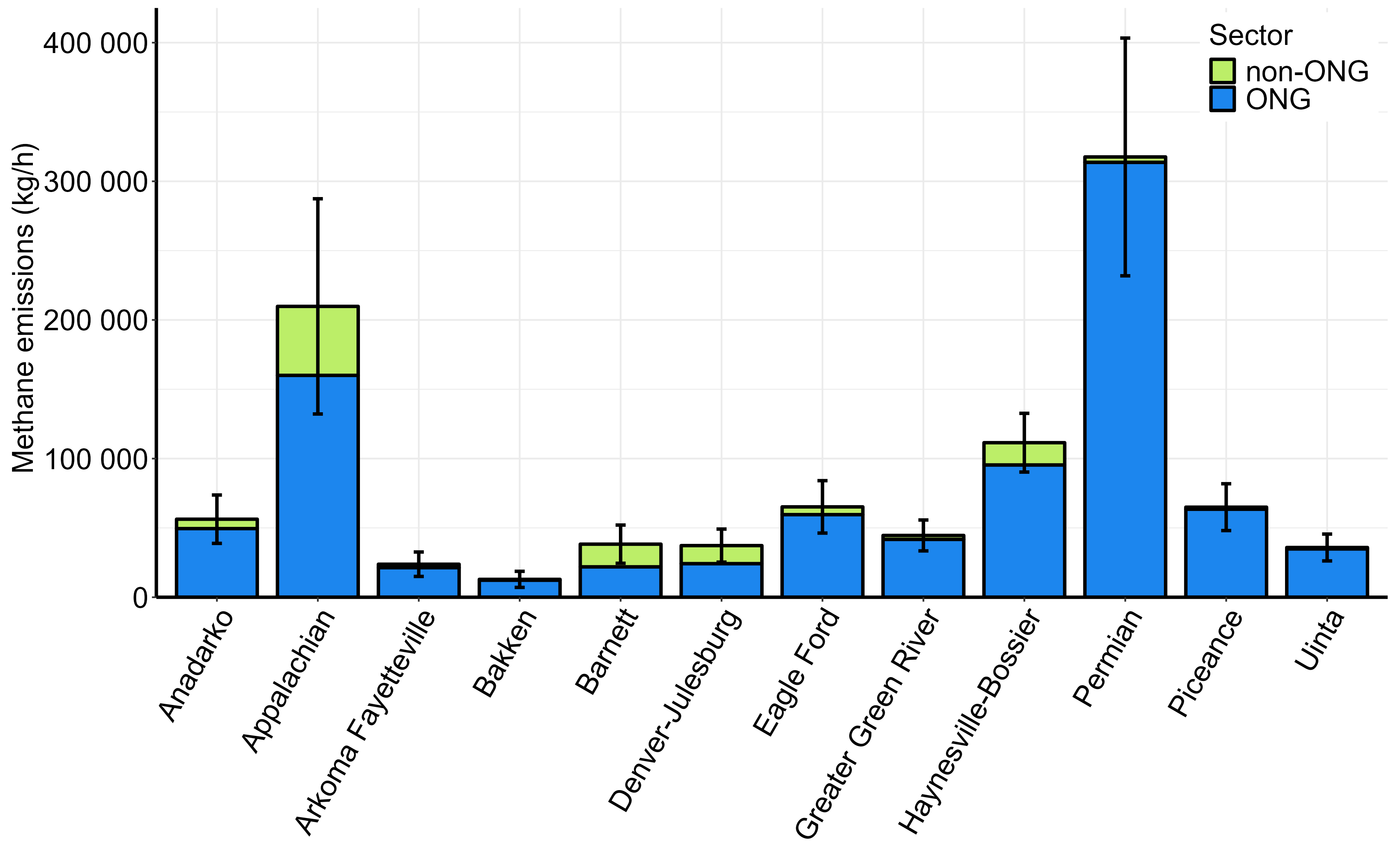 Figure 2Basin-level estimates of total methane emissions quantified by MethaneAIR with estimated contributions from oil and gas and non-oil and gas sectors. Total emissions across measured regions vary by an order of magnitude, with the Permian basin having the highest total emissions. Non-oil and gas emissions are most prevalent in the Appalachian, Barnett, Haynesville-Bossier, and Denver-Julesburg basins.