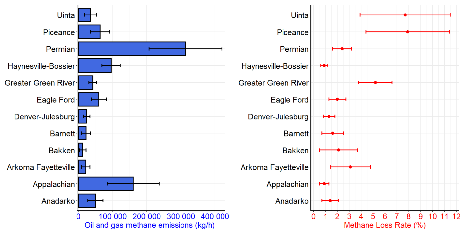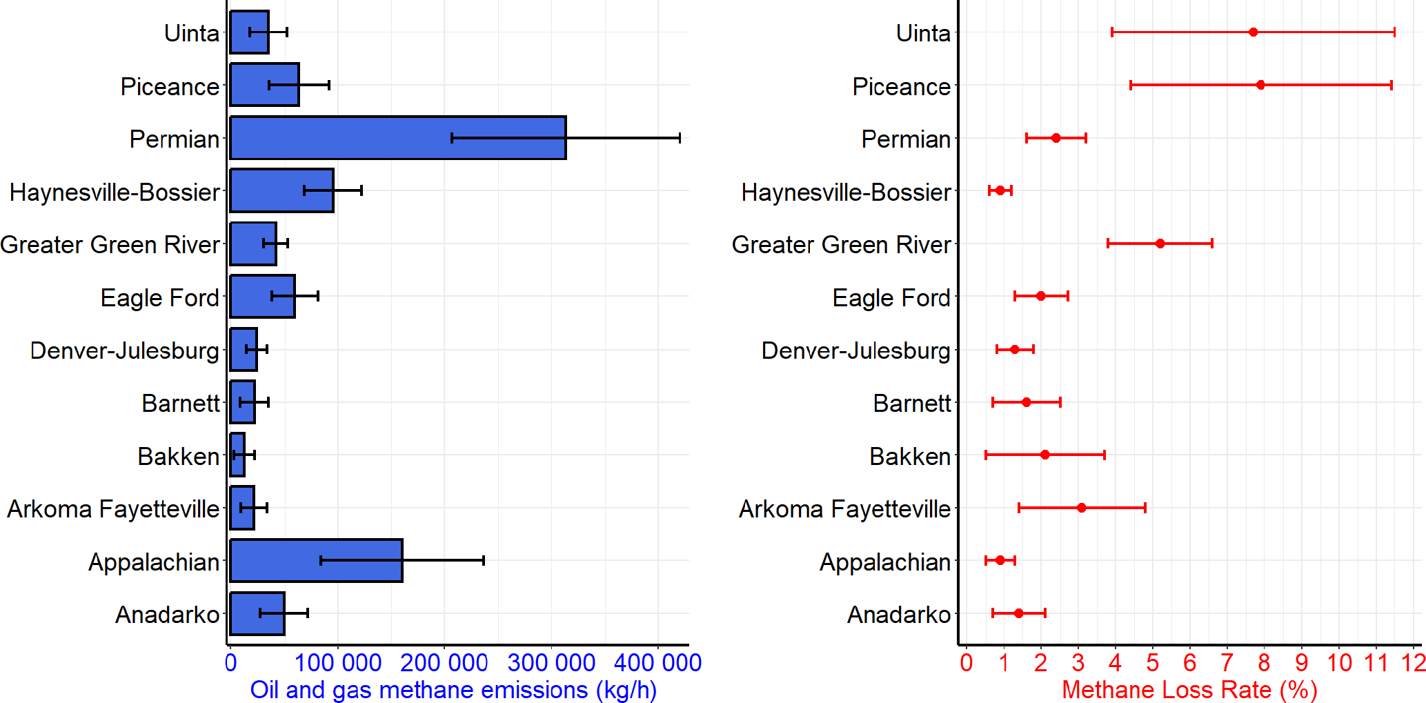 Figure 3Basin-level oil and gas methane emissions (kg h−1) and gas normalized loss rates (%) estimated from MethaneAIR data. Gas-dominant basins (Appalachian and Haynesville-Bossier) have the lowest loss rates (< 1 %), whereas low-producing basins with aging infrastructure (Piceance and Uinta) have higher loss rates (> 7 %).