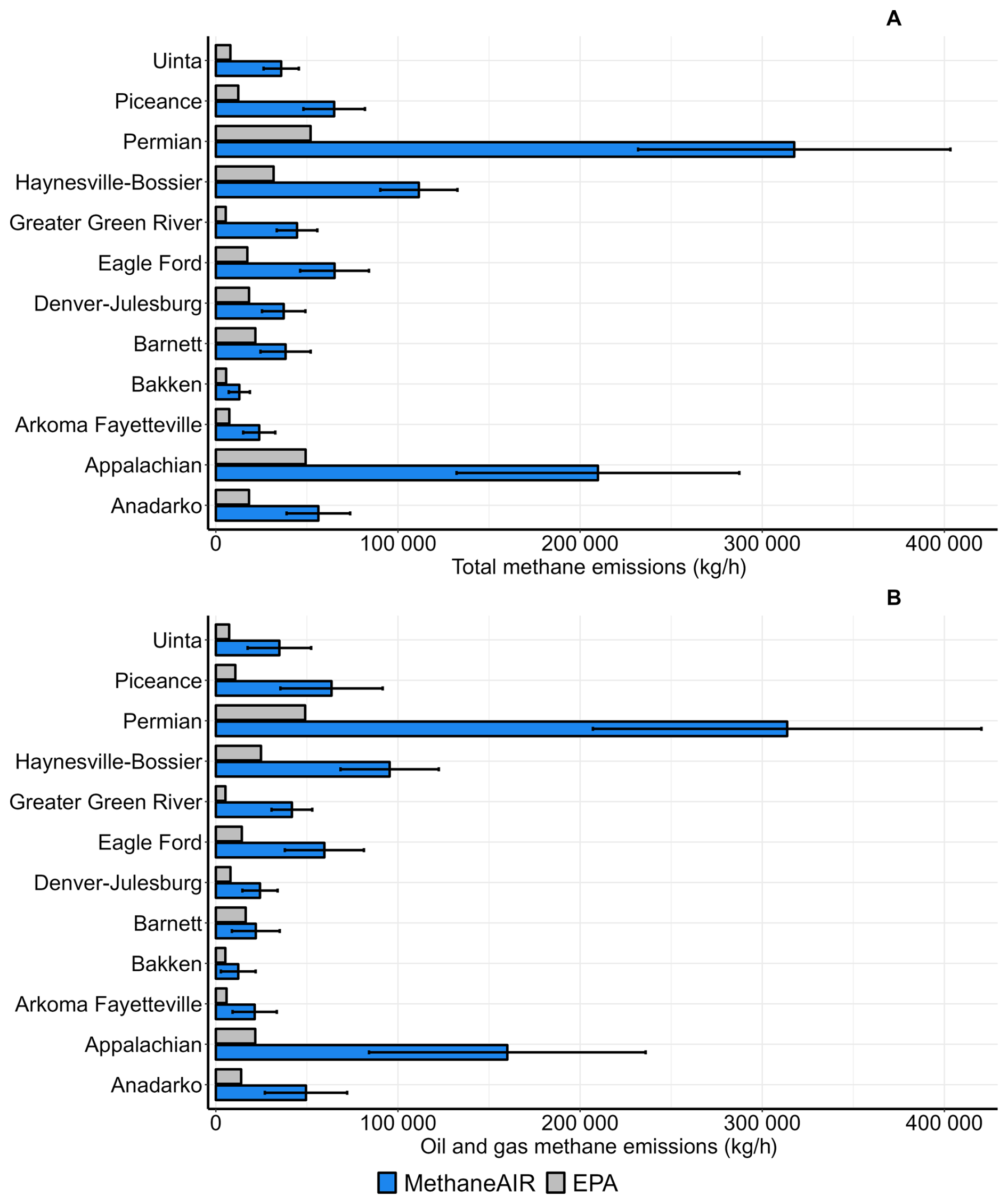 Figure 4Total methane emissions (A) and estimates oil and gas methane emissions (B) quantified by MethaneAIR compared to EPA (Maasakkers et al., 2023) reported emissions for the same regions. MethaneAIR estimates (blue bars) of total methane emissions range from 1.8 (Barnett) to 7.9 (Greater Green River) times higher than EPA estimates (grey bars).