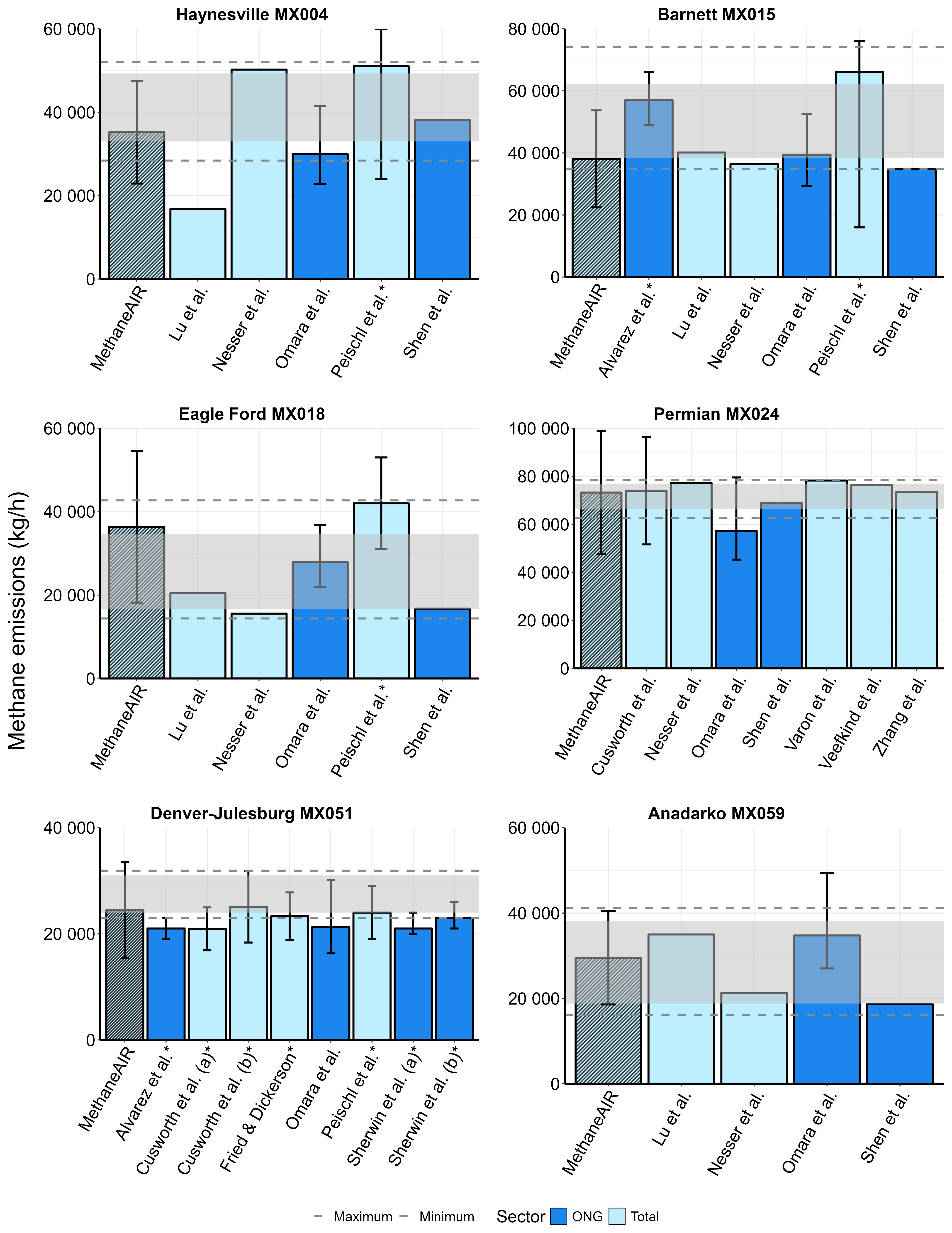 Figure 5Total methane emissions for six MethaneAIR flights compared to other measurement-based estimates reported in the literature. Studies marked with an asterisk indicate estimates that are for overlapping domains, whereas all others correspond to estimates within the exact MethaneAIR flight domain. The grey shaded area and dashed lines show the representative ranges of total methane emissions (95 % CI, minimum/maximum) derived from previous literature. The MethaneAIR quantification across different measured basins shows good agreement compared to other measurement-based estimates.