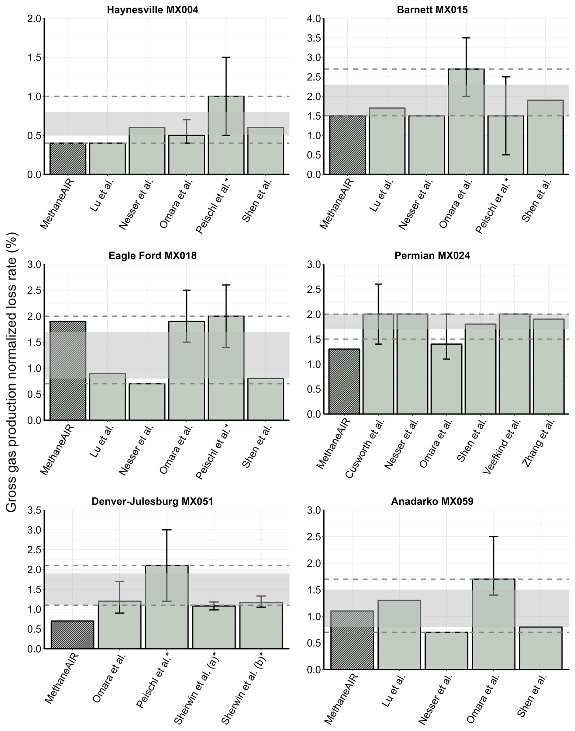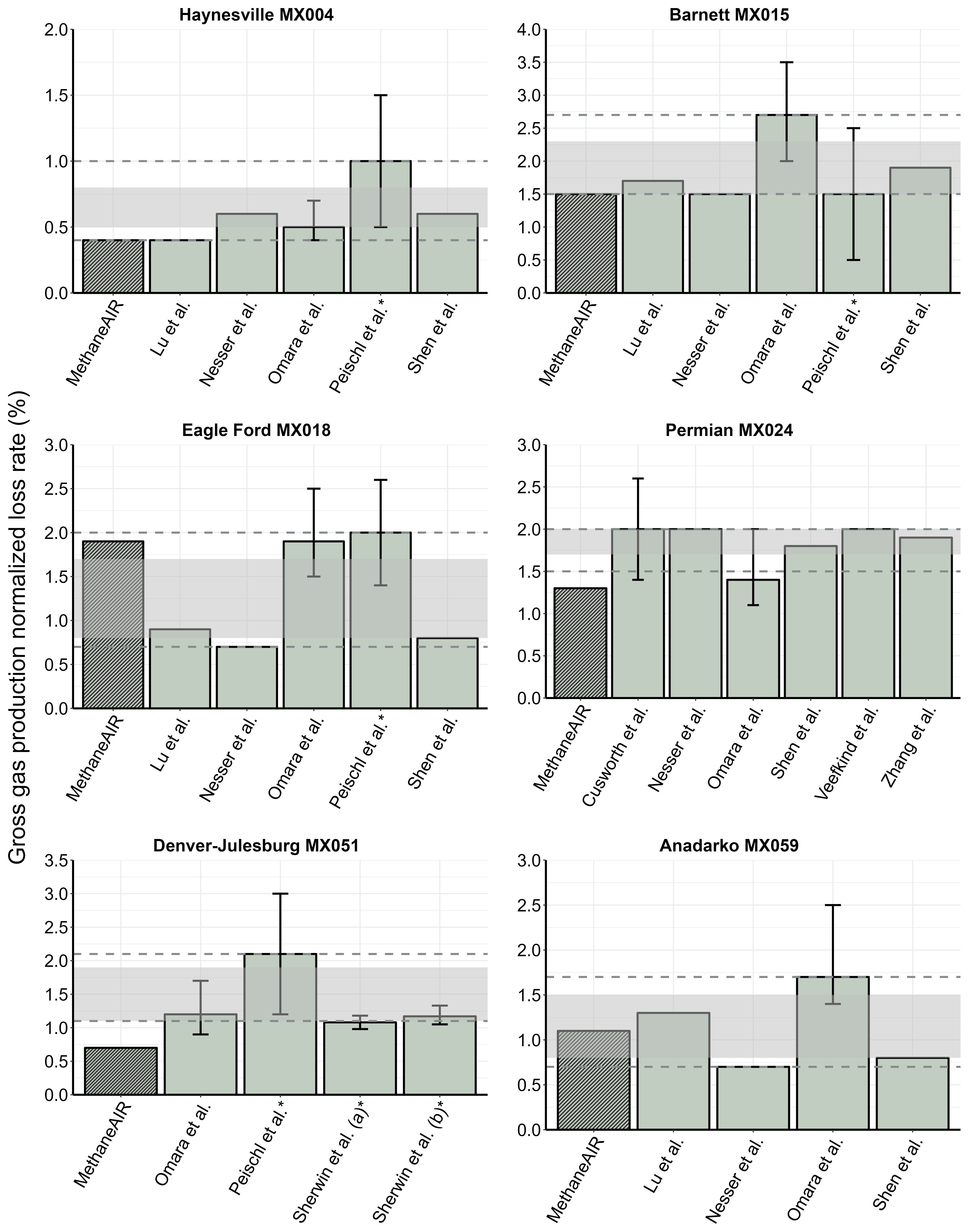 Figure 6Gross-gas production normalized methane loss rates for six MethaneAIR flights compared to other measurement-based estimates reported in the literature. Studies marked with an asterisk indicate estimates that are for overlapping domains, whereas all others correspond to estimates within the exact MethaneAIR flight domain. The grey shaded area and dashed lines show the representative ranges of loss rates (95 % CI, minimum/maximum) derived from previous literature. The MethaneAIR estimated loss rates across different measured basins show relatively good agreement compared to other loss rate estimates.
