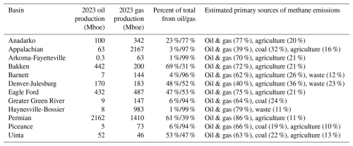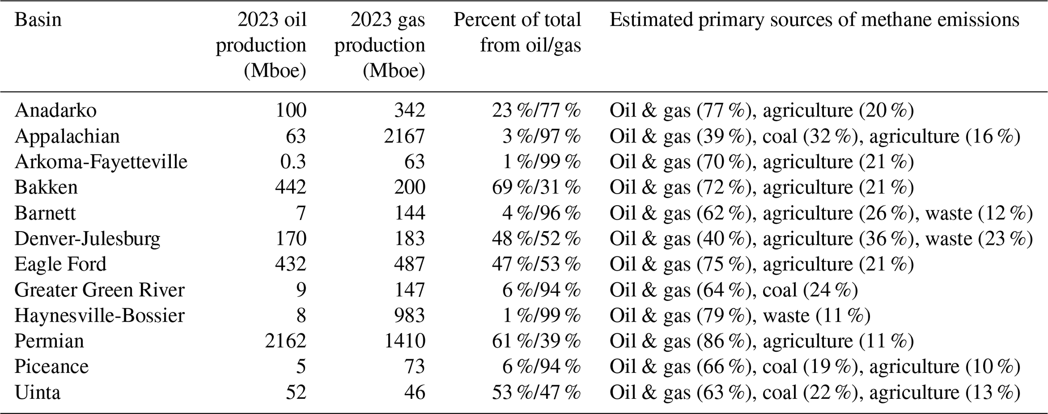 Table 1Summary statistics for the 12 oil and gas basins covered in this study. 2023 annual production data is from Enverus (Enverus, 2024), expressed as million barrels of oil equivalent (Mboe), using a conversion factor of 1 boe = 169.9 m3 of natural gas and 1 boe = 0.14 toe. Estimated primary sources of methane emissions are based on the EPA GHGI for 2020 (Maasakkers et al., 2023). Note that minor sources (contributing less than 10 % of total) are not listed, therefore percentages do not always add up to 100 %.
