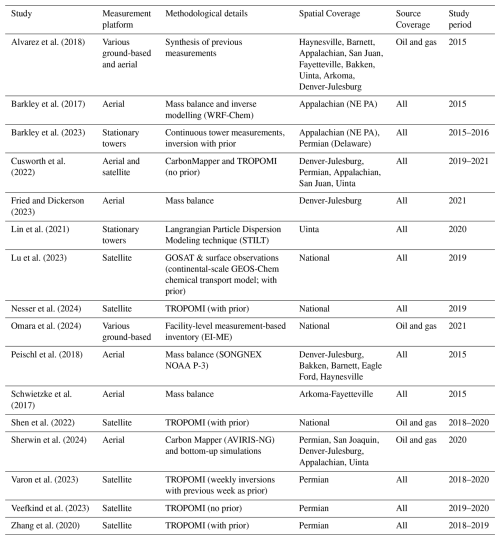 Where studies provide gridded methane emissions data products (e.g., Lu et al., 2023; Shen et al., 2022), we extracted and computed total methane emissions for the MethaneAIR study domains. For studies that report only total methane emissions for a defined area (Lin et al., 2021; Sherwin et al., 2024), we first compared the study domain with the MethaneAIR domains to assess the relative overlap. If there is a > 50 % geographic overlap with a given MethaneAIR domain, then the study is included in subsequent comparisons and analysis.