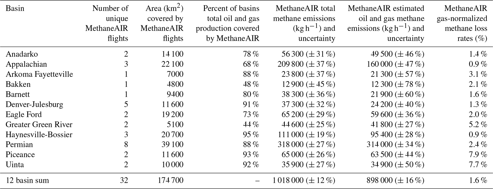 It is important to note that the resulting estimates represent the total methane emissions for the area within each basin that was explicitly measured by MethaneAIR across multiple flights, and not the entire geographic extent of each basin (Fig. 1). However, these measured areas cover more than two-thirds of each basin's total oil and gas production with several exceeding 90 % of the basin's production (except for the Bakken and Greater Green River basins) and combined make up 70 % of the CONUS onshore oil and gas production in 2023 (Table 3).
